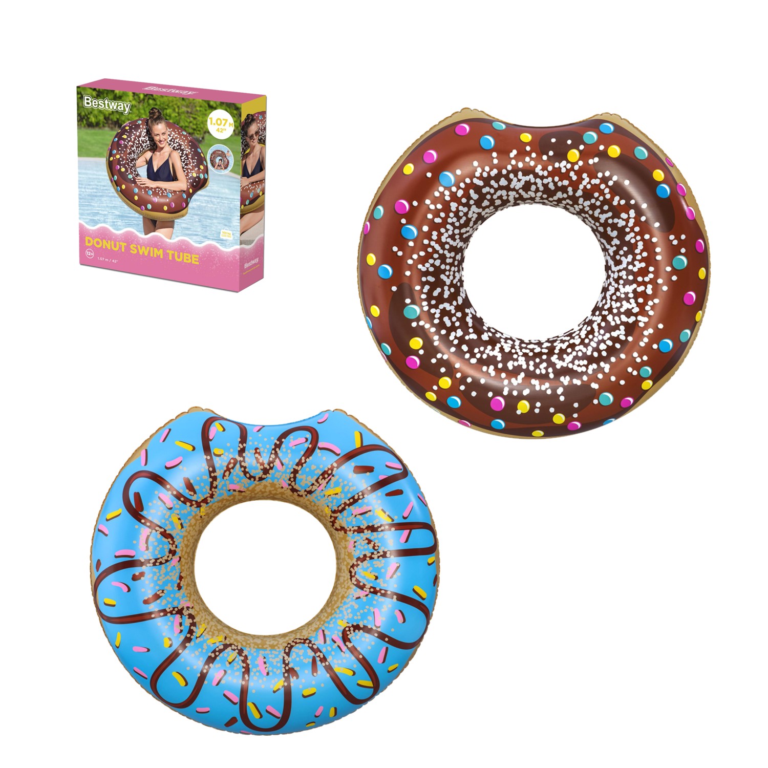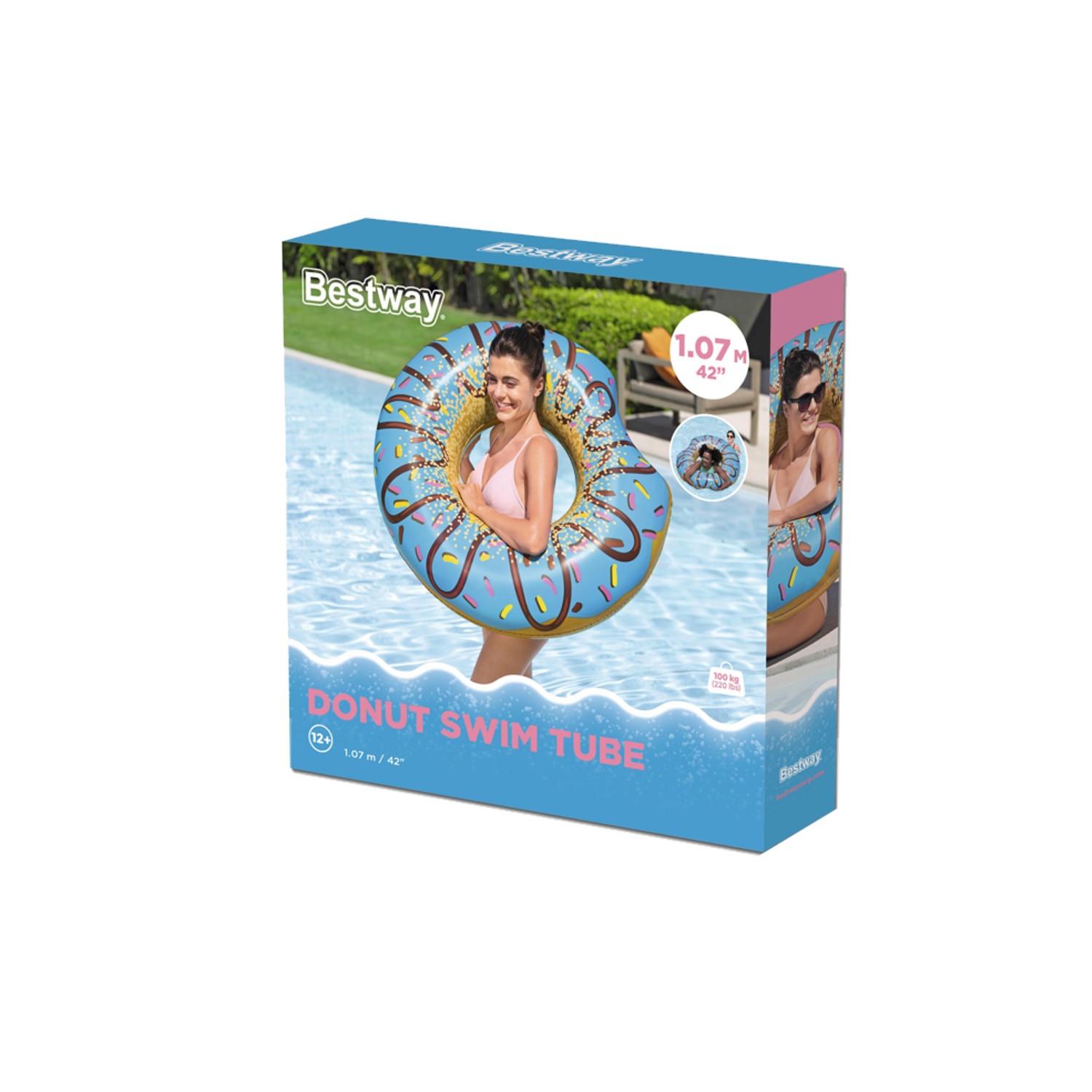 Компания Bestway, следуя новейшим тенденциям, стремится создавать потрясающие и неповторимые модели для взрослых и детей. Красивая цветовая гамма и оригинальный внешний вид непременно привлекут внимание других отдыхающих, ведь надувной пончик уже несколько сезонов подрядявляется настоящим хитом. Благодарядиаметру 107 смэтот фантастический круг подходит для плавания как взрослым, так и детям старше 12 лет. Изготовлен из очень прочного винила толщиной 0,24 мм. Также оснащен предохранительным клапаном, предотвращающим утечку воздуха. Пляжный круг лёгкий и удобный. Оно не занимает много места и не требует насоса для надувания, что позволяет взять его с собой куда угодно.