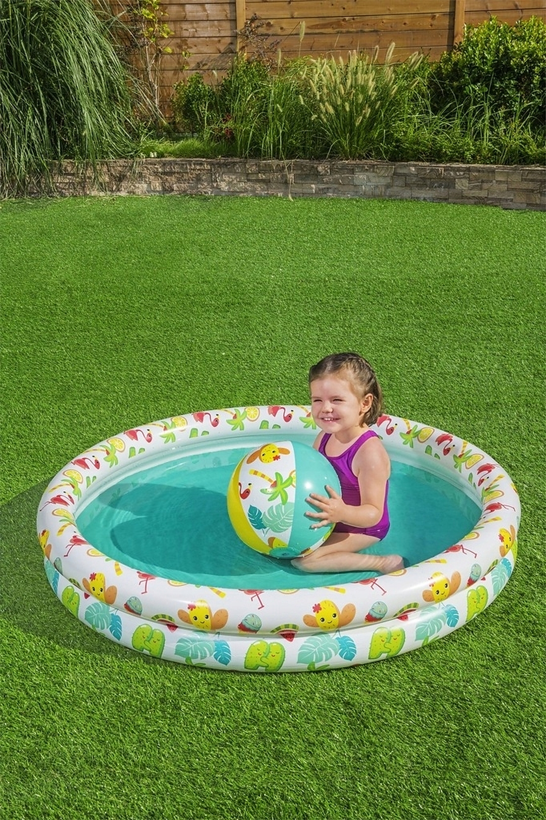 В комплект входит: бассейн, пляжный мяч, плавательный круг