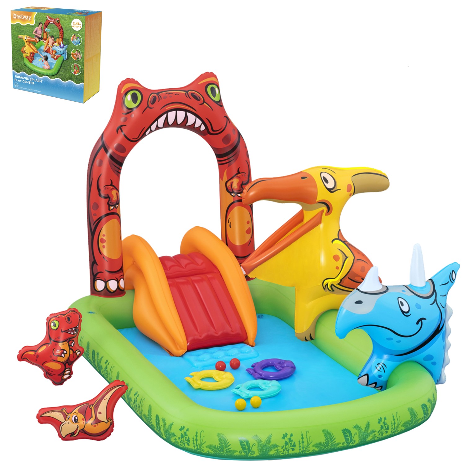 Надувная игровая площадка / бассейн с горкой Jurassic размером 2,41 x 1,4 x 1,37 м — это отличное развлечение для детей в саду. Игровая площадка, оснащенная водной горкой, обеспечит часы радости и активного отдыха на свежем воздухе. Благодаря просторным размерам дети могут свободно играть, а водная горка добавляет увлекательности. Идеальный выбор для летних дней, создающий прекрасные условия для игр с водой в саду.