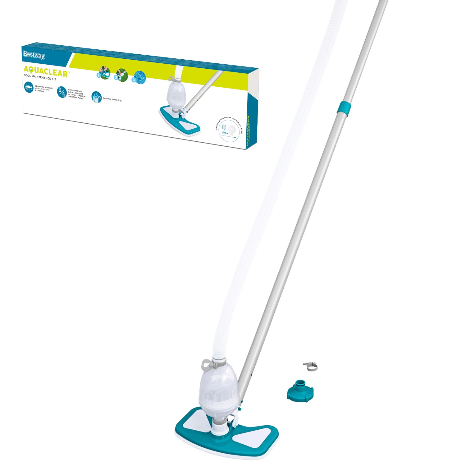 🌟 Набор для очистки AquaClean™ от Bestway® предлагает владельцам бассейнов отличную альтернативу ручному удалению загрязнений из бассейна. Просто подключите фильтрующий насос, и у вас под рукой окажется мощный и легкий пылесос с очень длинным шлангом (24,5 фута), который позволит легко очистить стенки и дно бассейна.🧹 Входящая в комплект сетка для бассейна собирает листья, а пылесос всасывает водоросли, мусор и загрязнения.9-футовая алюминиевая штанга позволяет пылесосу и сетке очищать труднодоступные участки наземных бассейнов. Загрязнения собираются в съемный многоразовый мешок.🔧 В комплект входит множество переходников для подключения ко всем бассейнам Bestway® и системам фильтрации. Подходит для фильтрующих насосов с производительностью 530 гал./ч (2006 л/ч) и выше, а также идеально подходит для всех наземных бассейнов.