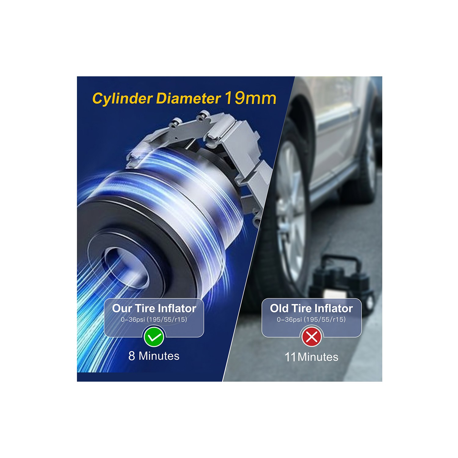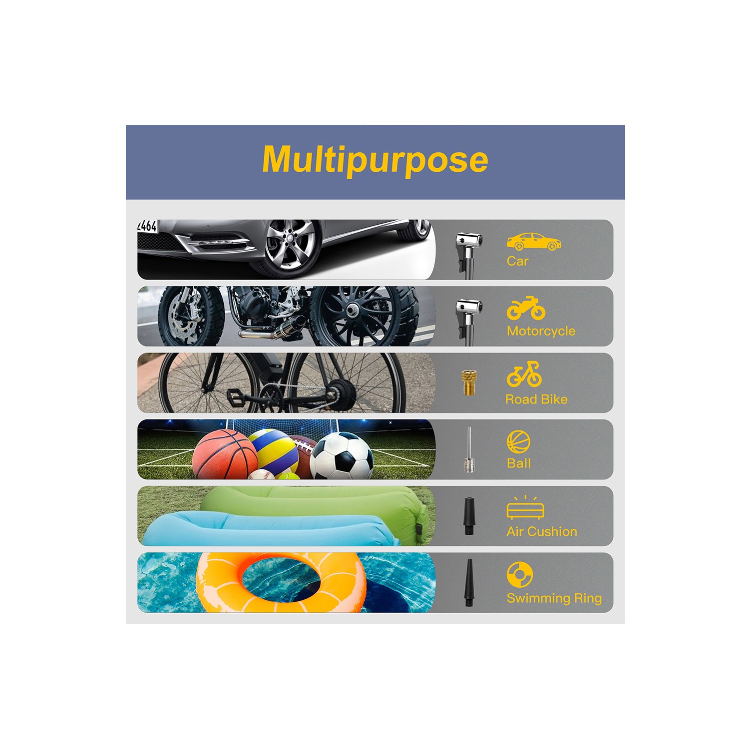 Компактный размер – удобен для переноскиУдобная ручка – идеально подходит для использования в полевых условияхФункция powerbank – заряжайте другие устройстваДвойной цифровой дисплей – отображает целевое давление Автоматическое отключение – насос останавливается при достижении заданного давленияВстроенная светодиодная лампа с 3 режимами: стандартный, SOS, мигающий4 единицы измерения давления на выбор: PSI, KPA, BAR, KG/CM25 режимов быстрого выбора: автомобиль, мотоцикл, велосипед, спортивный мяч, ручной режимРучной режим с функцией памяти Встроенный охлаждающий вентилятор – обеспечивает длительный срок службы устройстваКлапан выпуска воздуха – простое регулирование давленияТехнические характеристики:Материал: ABS + металлНапряжение: DC 7,4 В (от аккумулятора)Мощность: 50 ВтЕмкость аккумулятора: 13,32 Вт·ч (3600 мА·ч)Диаметр цилиндра / расход воздуха: 19 мм / 19 л/минВремя накачивания: около 7,5 минут (±30 сек.) для шины 195/65/R15 (при полной зарядке)Максимальное давление: 150 PSI / 10,3 BARУровень шума: <85 дБ (с расстояния 1,5 м)Время зарядки: около 4–5 часовКоличество накачанных шин за одну зарядку: около 2,5 шин 195/65/R15Аксессуары в комплекте:4 дополнительных насадки (форсунки)Кабель для зарядки USB типа C (1 шт.)