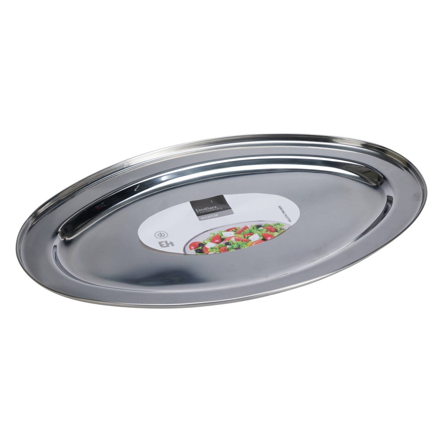 Овальная тарелка из нержавеющей стали размером 45 × 29 см. Идеально подходит для подачи напитков и закусок, прочная и легкая в уходе.