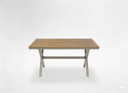 Представляем современный садовый стол, который сочетает в себе минималистичный дизайн, высокую прочность и комфорт повседневного использования. Бежевая алюминиевая конструкция в сочетании со столешницей из материала, имитирующего дерево, делает стол идеальным дополнением к дизайну сада, террасы или патио.Это универсальное решение как для частных, так и для коммерческих пространств.