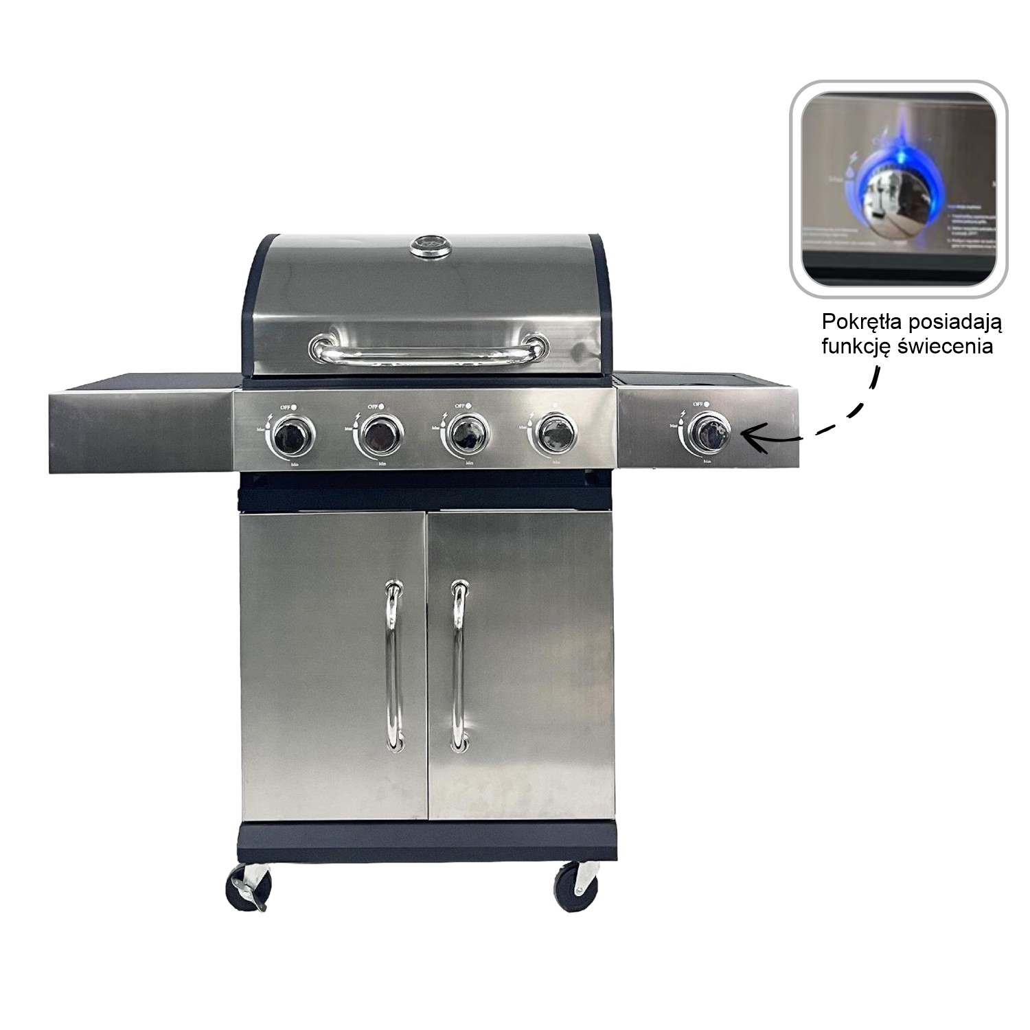 С 4 основными горелками + боковой, мощностью 13 кВт и чугунными решетками он предлагает профессиональные условия для приготовления идеальных блюд. А также подсвечиваемые ручки, чехол в комплекте и стильная отделка из нержавеющей стали.