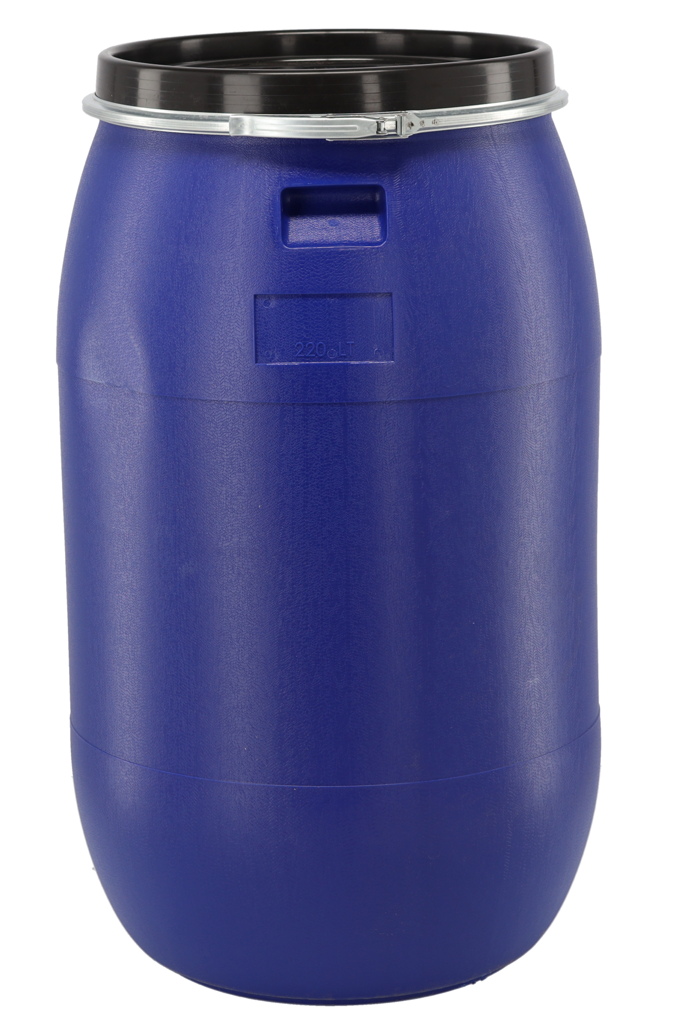 Прочная бочка объемом 220 литров, оснащенная металлическим хомутом и крышкой в комплекте. Изготовлена из прочного материала синего цвета, идеально подходит для переработки и хранения различных продуктов.