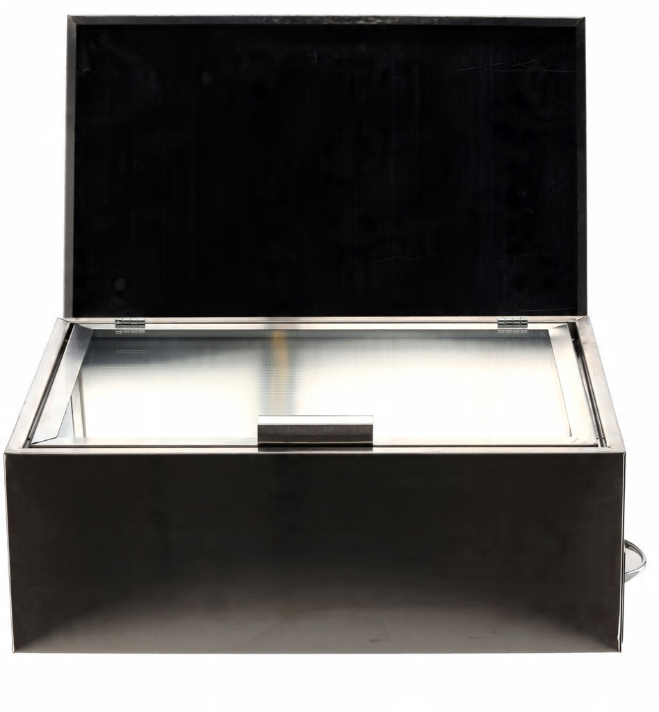 Однорамочный солнечный плавильник, изготовленный из толстой нержавеющей стали.
