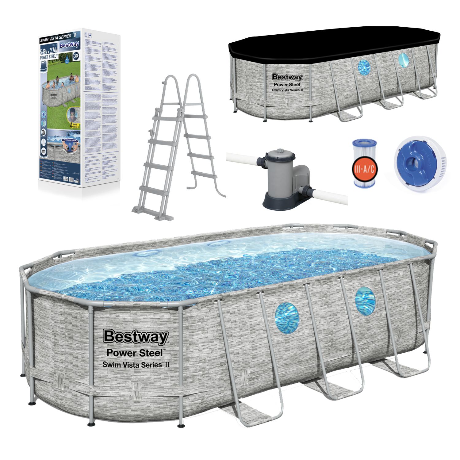 Этот наземный бассейновый комплект также оснащен фильтрующей помпой, защитной лестницей, чехлом для бассейна и дозатором химикатов ChemConnect™. Дозатор ChemConnect поддерживает чистоту и здоровье воды в бассейне, обеспечивая стабильный уровень хлора, который равномерно распределяется по всему бассейну.