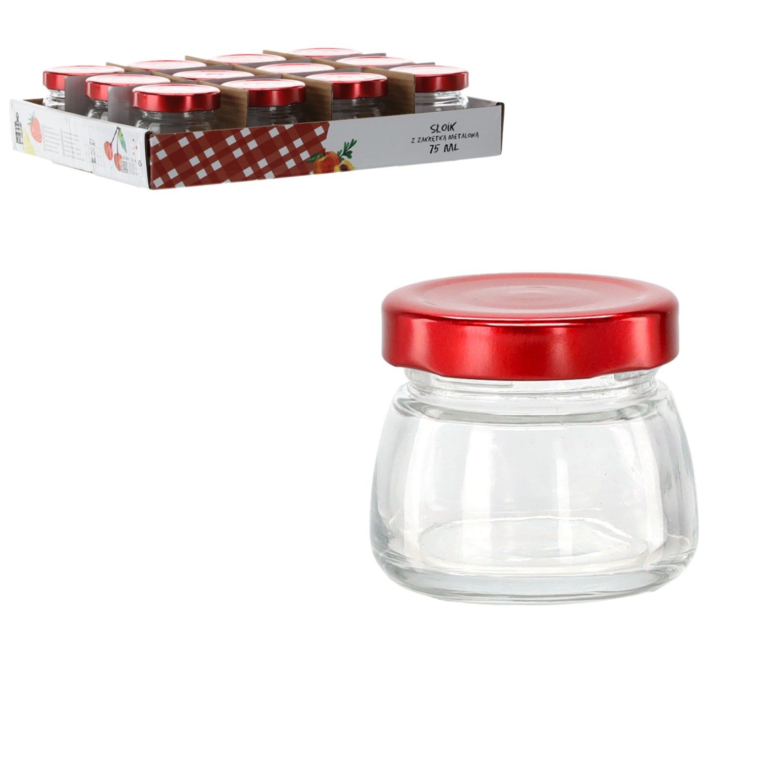 Банка объемом 75 мл, изготовленная из высококачественного стекла, является отличным вариантом для хранения меда, джемов, специй и других мелких продуктов. Оснащенная красной металлической крышкой, она обеспечивает герметичность и свежесть хранящихся продуктов. Продукт упакован на дисплеях по 12 штук, что облегчает презентацию и розничную продажу.