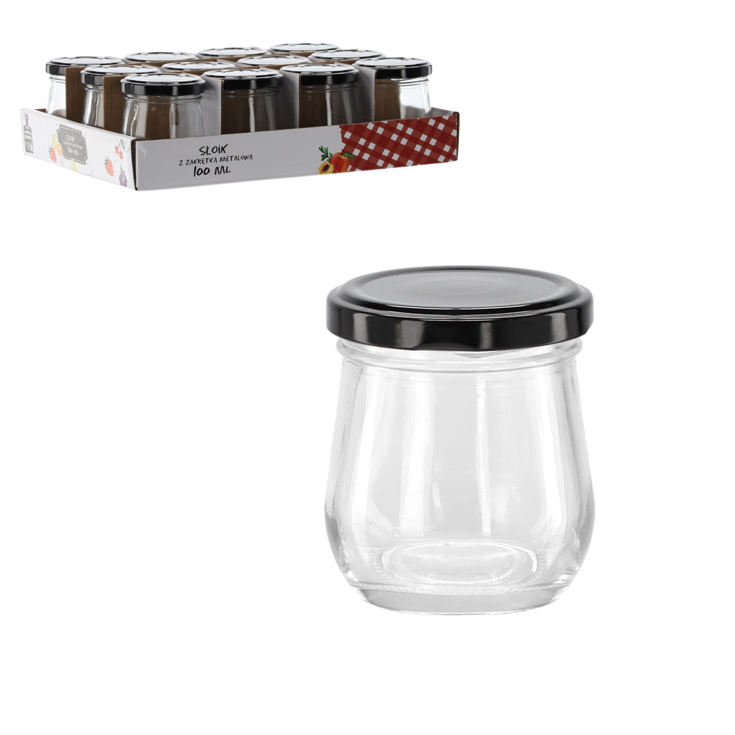 Банка объемом 100 мл является идеальным вариантом для хранения меда, джемов, специй и других мелких продуктов. Оснащенная черной металлической крышкой, она обеспечивает герметичность и свежесть хранящихся продуктов. Продукт упакован на дисплеях по 12 штук, что облегчает презентацию и розничную продажу.