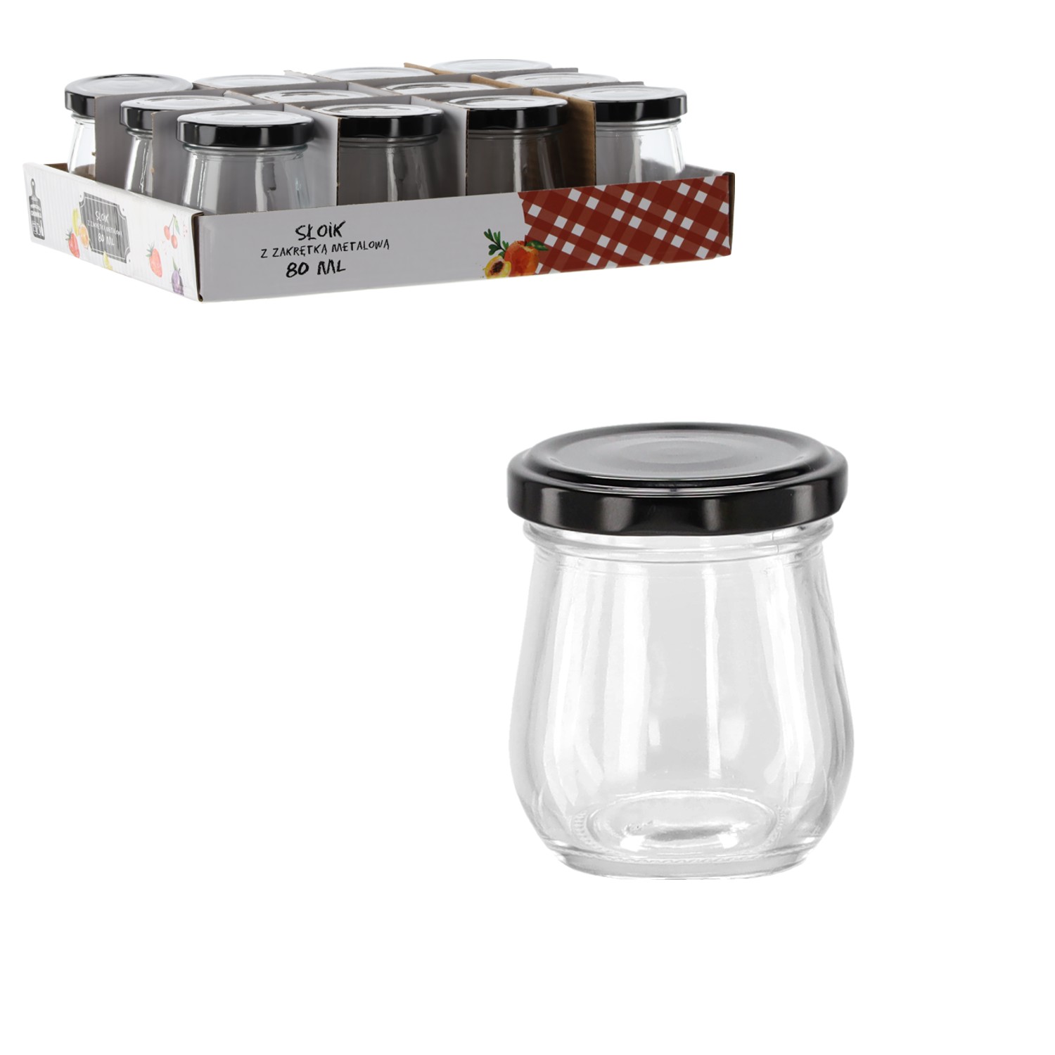 Банка объемом 80 мл является идеальным вариантом для хранения меда, джемов, специй и других мелких продуктов. Оснащенная черной металлической крышкой, она обеспечивает герметичность и свежесть хранящихся продуктов. Продукт упакован на дисплеях по 12 штук, что облегчает презентацию и розничную продажу.