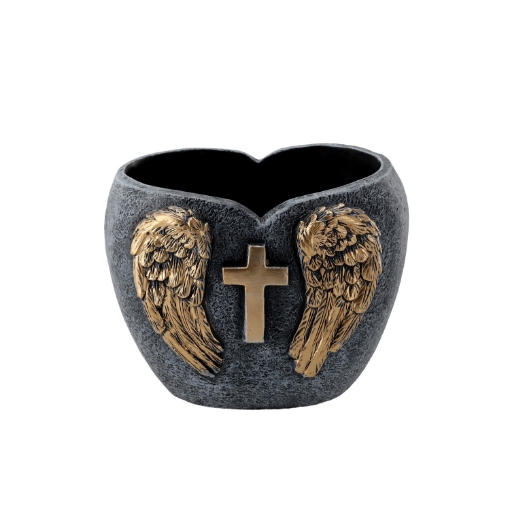 Тщательно изготовленный горшок/кашпо в форме сердца, украшенный золотыми деталями в виде крыльев. Идеальная основа для надгробных композиций, которая придаст им особый характер и символику памяти. Изготовлен из прочного цемента темно-серого цвета с золотыми акцентами.