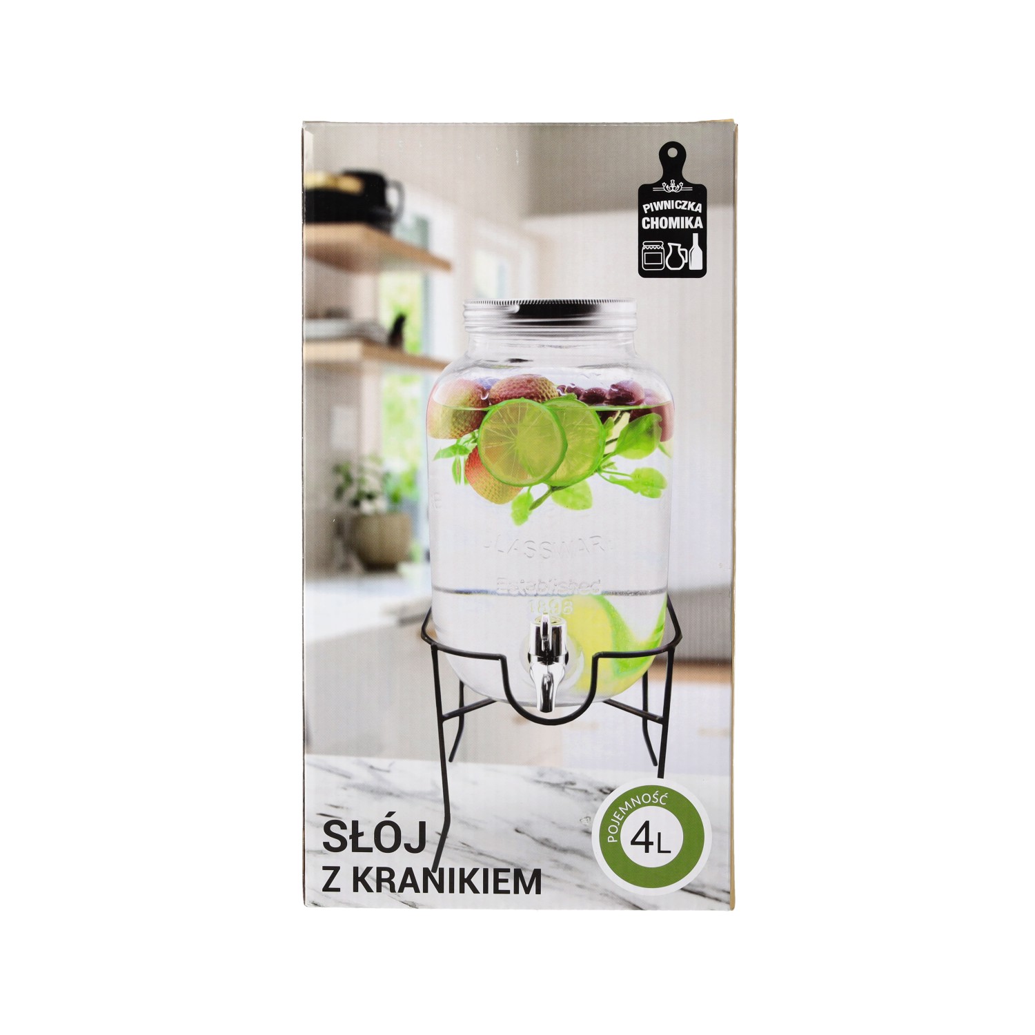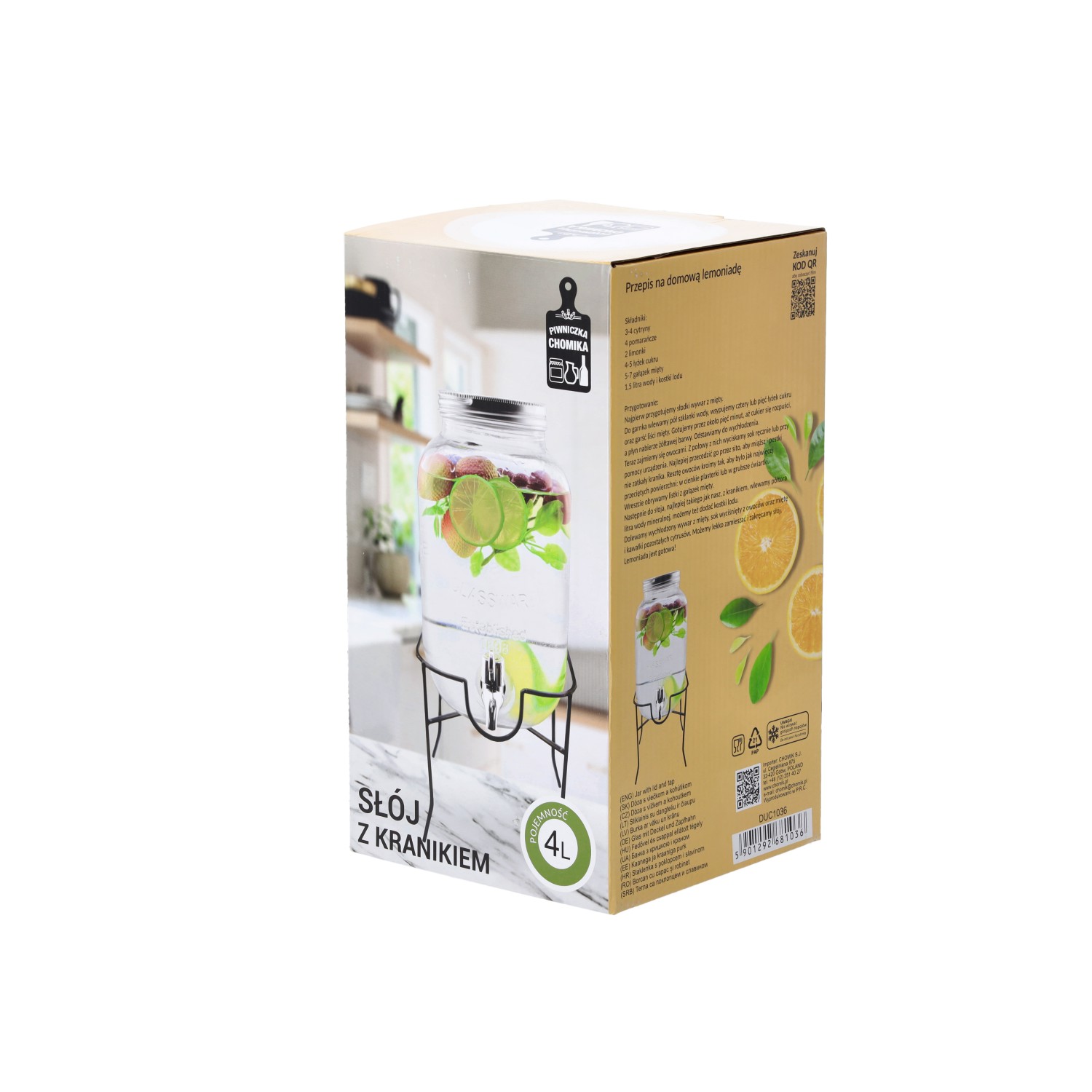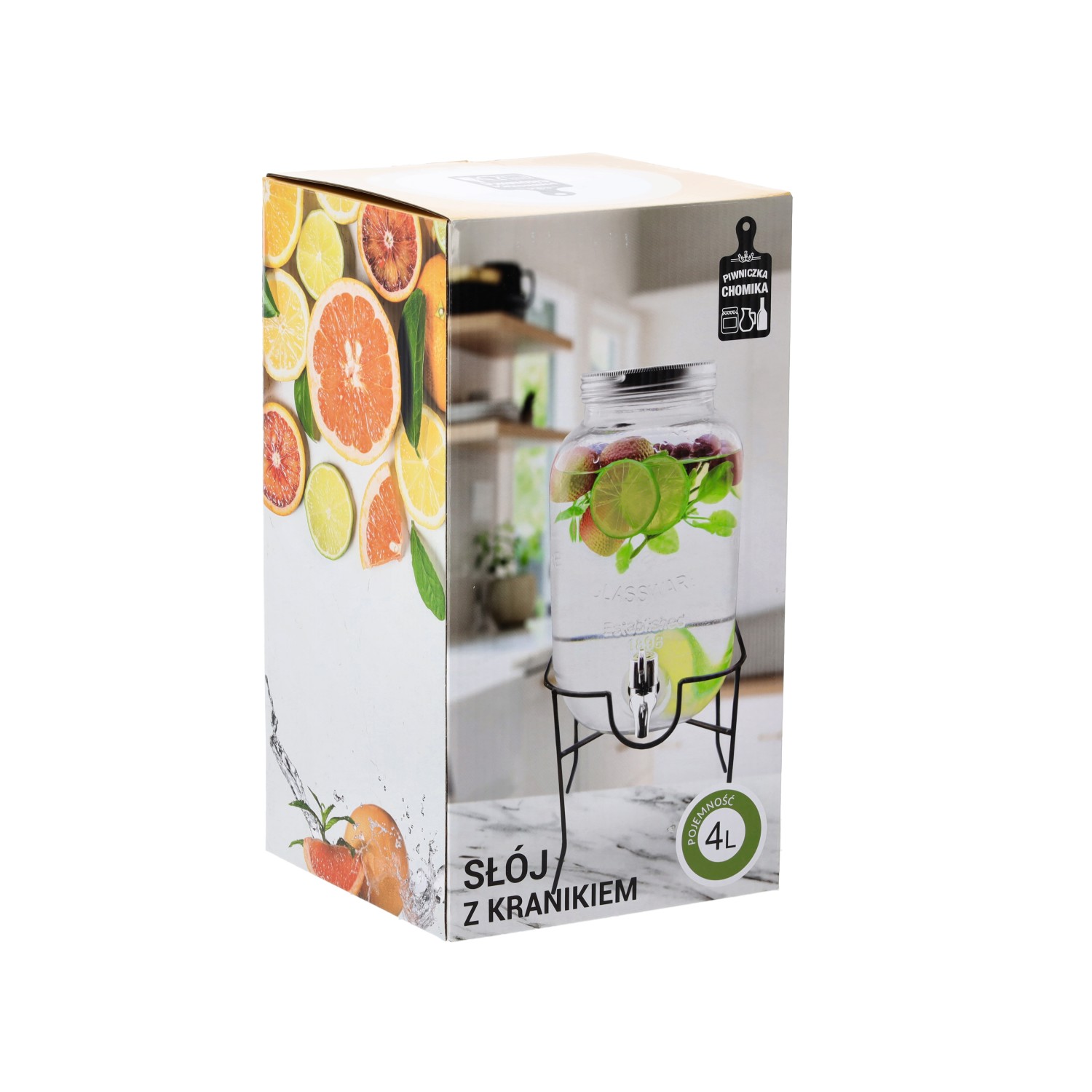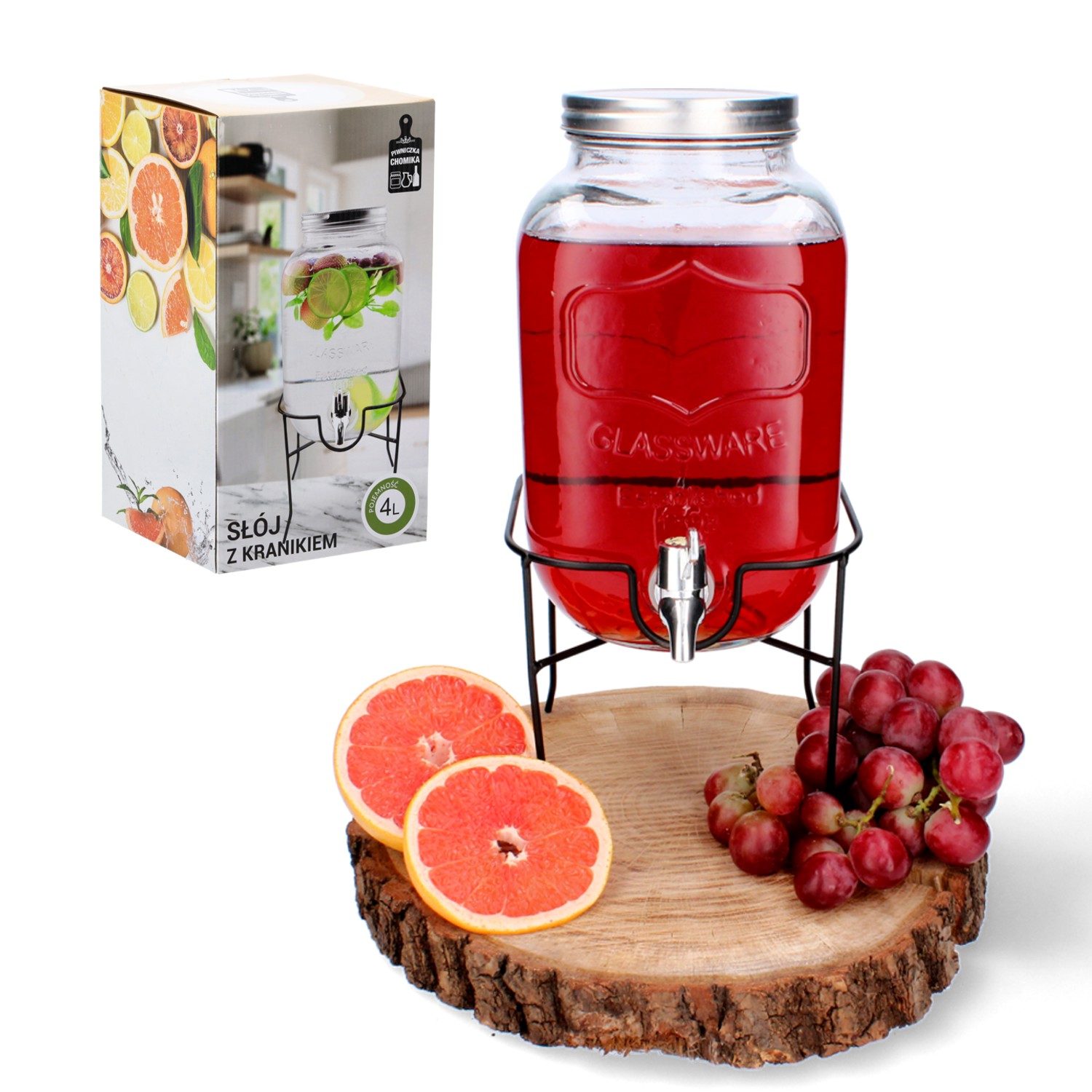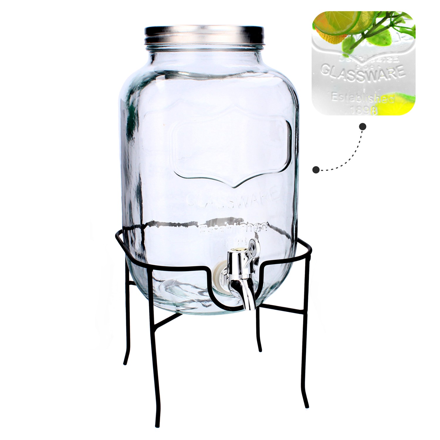 Банка из толстого стекла с тиснением «Established 1898». Имеет металлическую крышку и краник для дозирования напитка. Массивная и устойчивая, из высококачественного стекла. В комплекте металлическая подставка, благодаря которой можно без проблем поставить высокий стакан под кран. Банка эффектно смотрится на столе, может стать отличным подарком и украшением любого мероприятия дома или в профессиональном заведении.