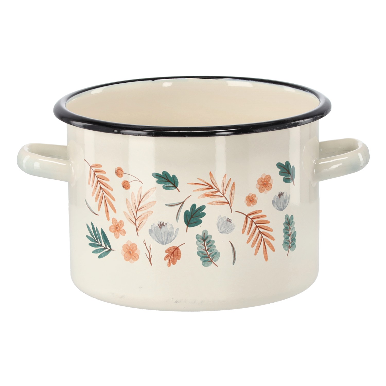 Практичная эмалированная кастрюля объемом 3 литра и диаметром 18 см кремового цвета с декоративным узором в виде листьев. Идеально подходит для повседневного приготовления пищи, сочетая в себе прочность и эстетичный дизайн.