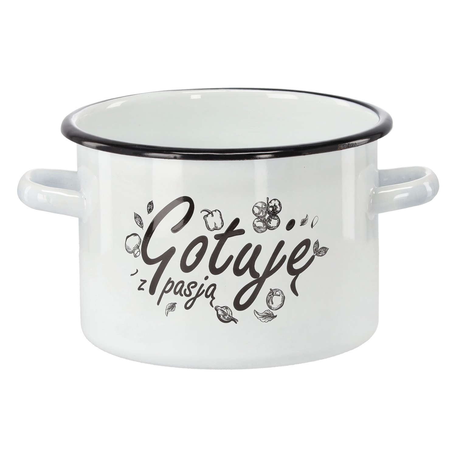 Практичная эмалированная кастрюля объемом 3 литра и диаметром 18 см белого цвета, украшенная надписью «ГОТОВЛЮ С СТРАСТЬЮ». Идеально подходит для повседневного приготовления пищи, сочетая в себе прочность и уникальный дизайн.
