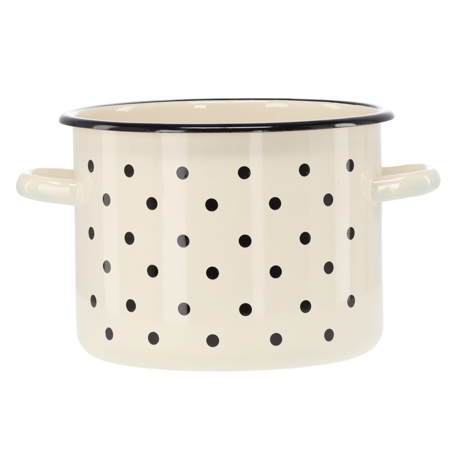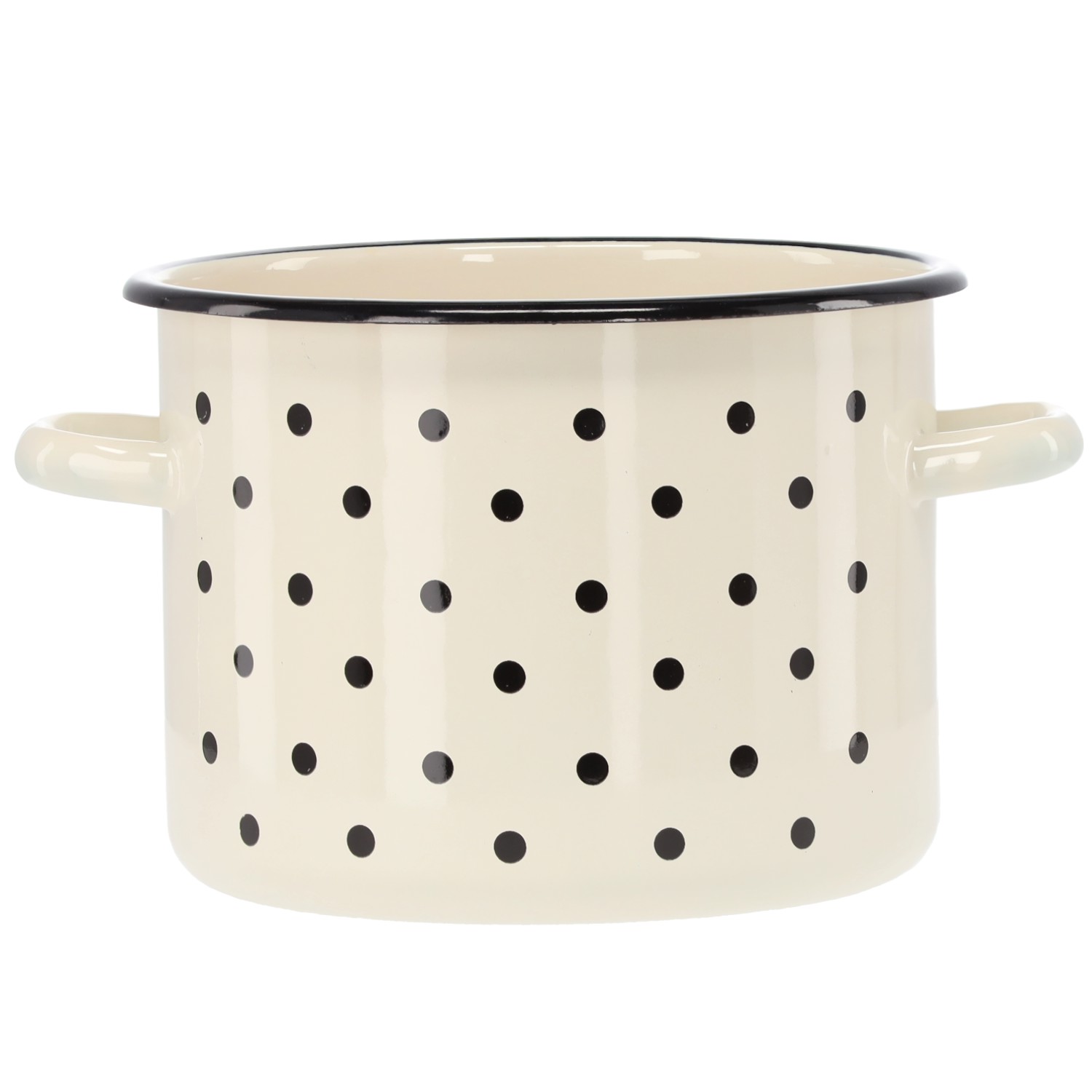Эмалированная кастрюля объемом 4,5 литра и диаметром 20 см белого цвета с узором в виде точек. Практичная и прочная.