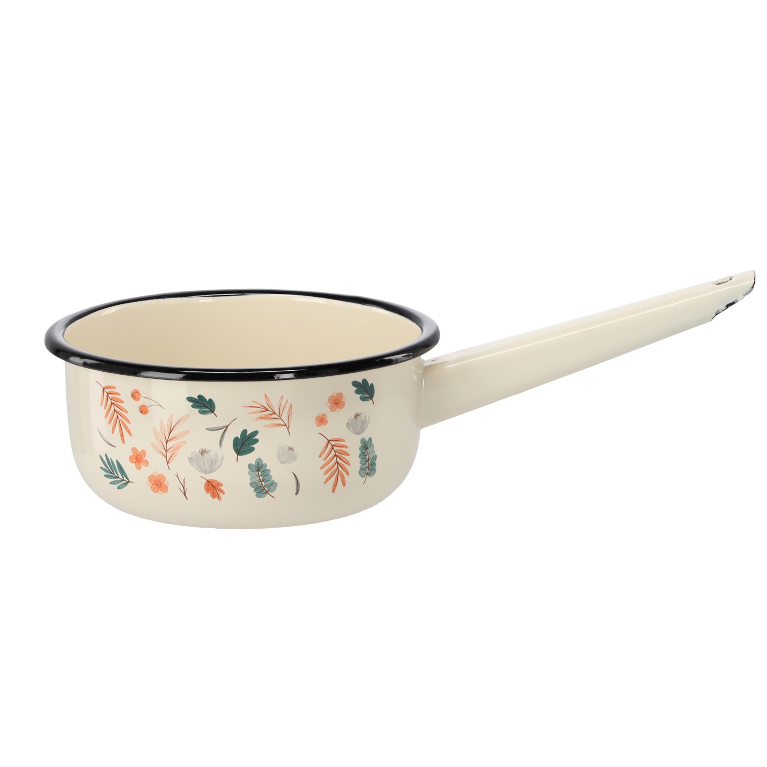 Практичная эмалированная кастрюля объемом 1,5 литра и диаметром 16 см кремового цвета с декоративным мотивом листьев. Идеально подходит для подогрева молока, приготовления соусов или варки небольших порций блюд. Эмалевое покрытие устойчиво к коррозии, легко моется и безопасно при контакте с пищевыми продуктами. Оснащен удобной ручкой, которая обеспечивает комфорт и безопасность использования.