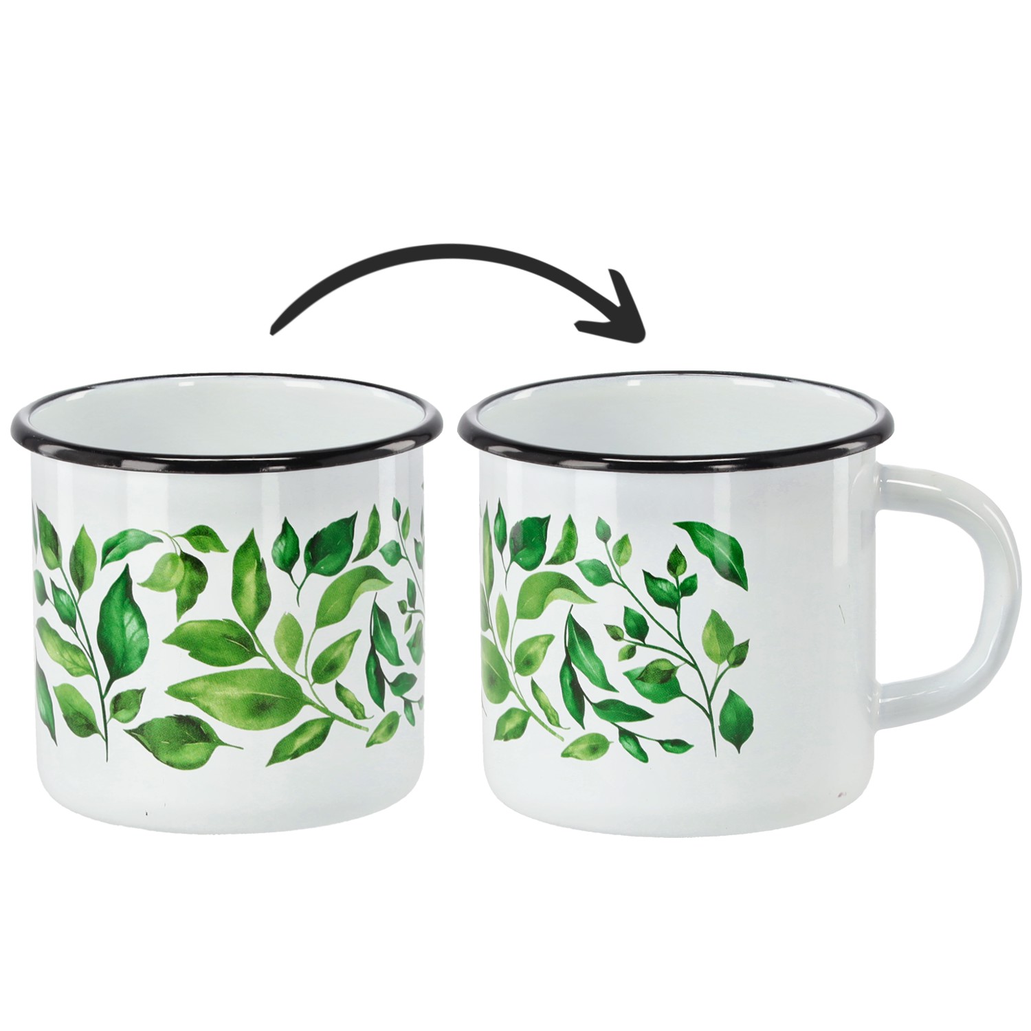 Эмалированный кубок объемом 1 л и высотой 11 см с декоративным рисунком фикуса. Практичный и прочный.