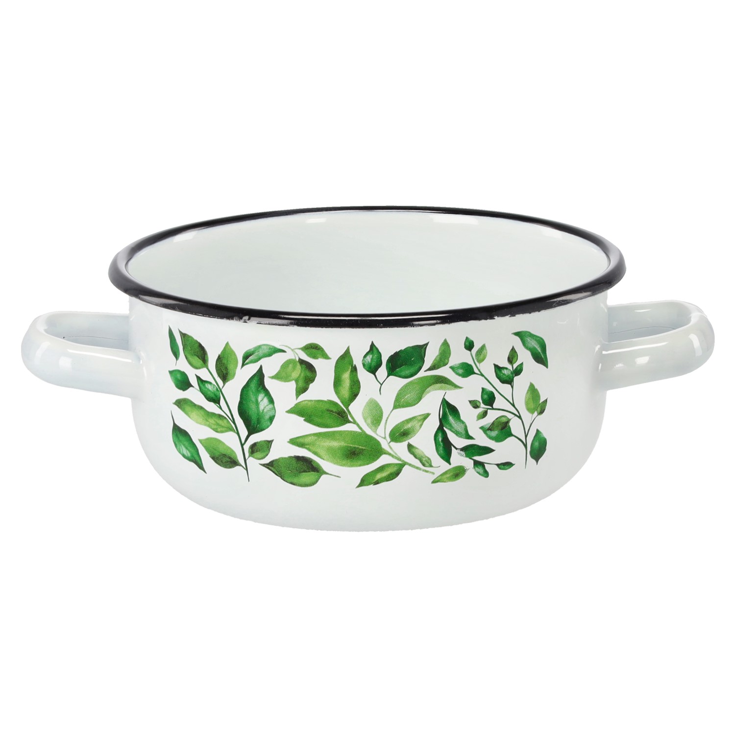Практичная эмалированная кастрюля объемом 1,5 литра и диаметром 16 см белого цвета с декоративным узором фикуса. Оснащена двумя ручками для удобства использования. Идеально подходит для повседневного приготовления и подогрева пищи.
