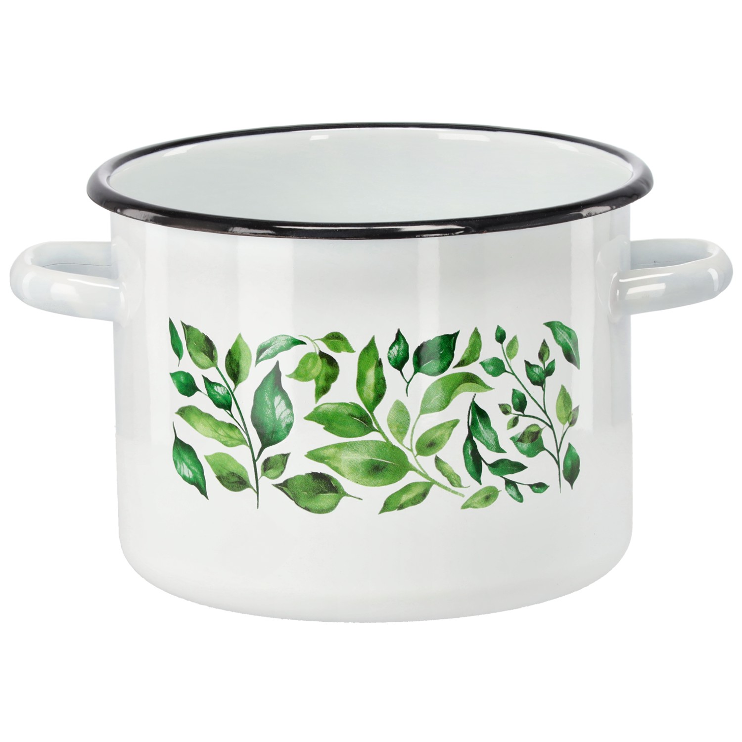 Практичная эмалированная кастрюля объемом 4,5 литра и диаметром 20 см белого цвета с декоративным узором фикуса. Идеально подходит для повседневного приготовления пищи, сочетая в себе прочность и эстетичный дизайн.