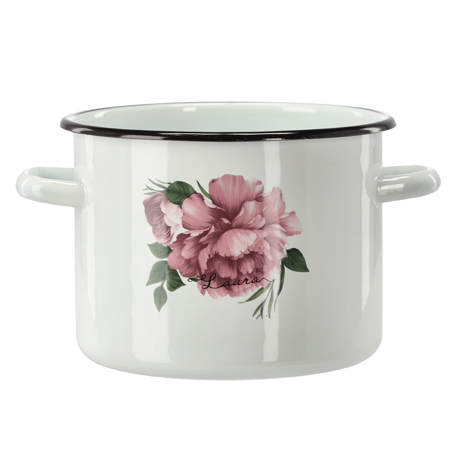 Практичная эмалированная кастрюля объемом 4,5 литра и диаметром 20 см белого цвета с декоративным узором пионы Laura. Идеально подходит для повседневного приготовления пищи, сочетая в себе прочность и эстетику.