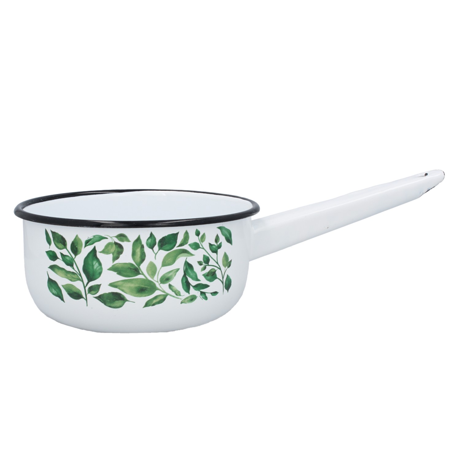 Практичная эмалированная кастрюля объемом 1,5 литра и диаметром 16 см белого цвета с декоративным рисунком фикуса. Оснащена удобной ручкой для комфортного использования. Идеально подходит для повседневного приготовления и подогрева пищи.