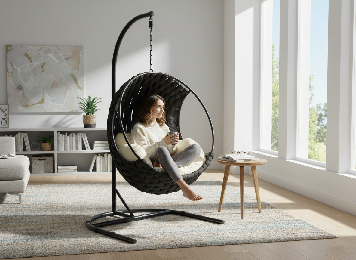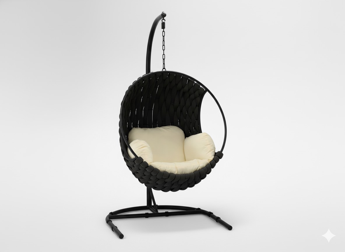 Элегантность, комфорт и прочность — всё это сочетает в себе подвесное кресло TABANI в классическом чёрном цвете с бежевой подушкой. Идеально подходит для отдыха в саду, на террасе или даже в просторной гостиной.