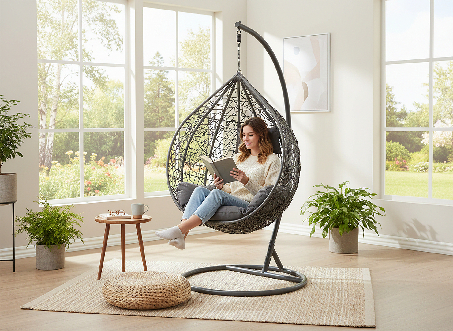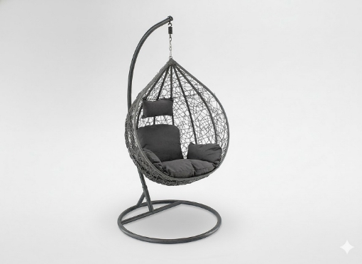 Вам необходимо расслабиться с книгой, чашкой кофе или в тишине? Подвесное кресло в оттенках темно-серого цвета является идеальным решением для вашей зоны отдыха.