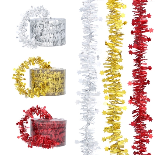 Пушистая цепочка для елки со звездочками. Традиционная и блестящая, она украсит вашу елку своим классическим шармом. Идеально сочетается с цветными шарами и другими рождественскими украшениями.На выбор предлагаются 3 цвета:-КРАСНЫЙ-ЗОЛОТОЙ-СЕРЕБРЯНЫЙДлина: 7 м
