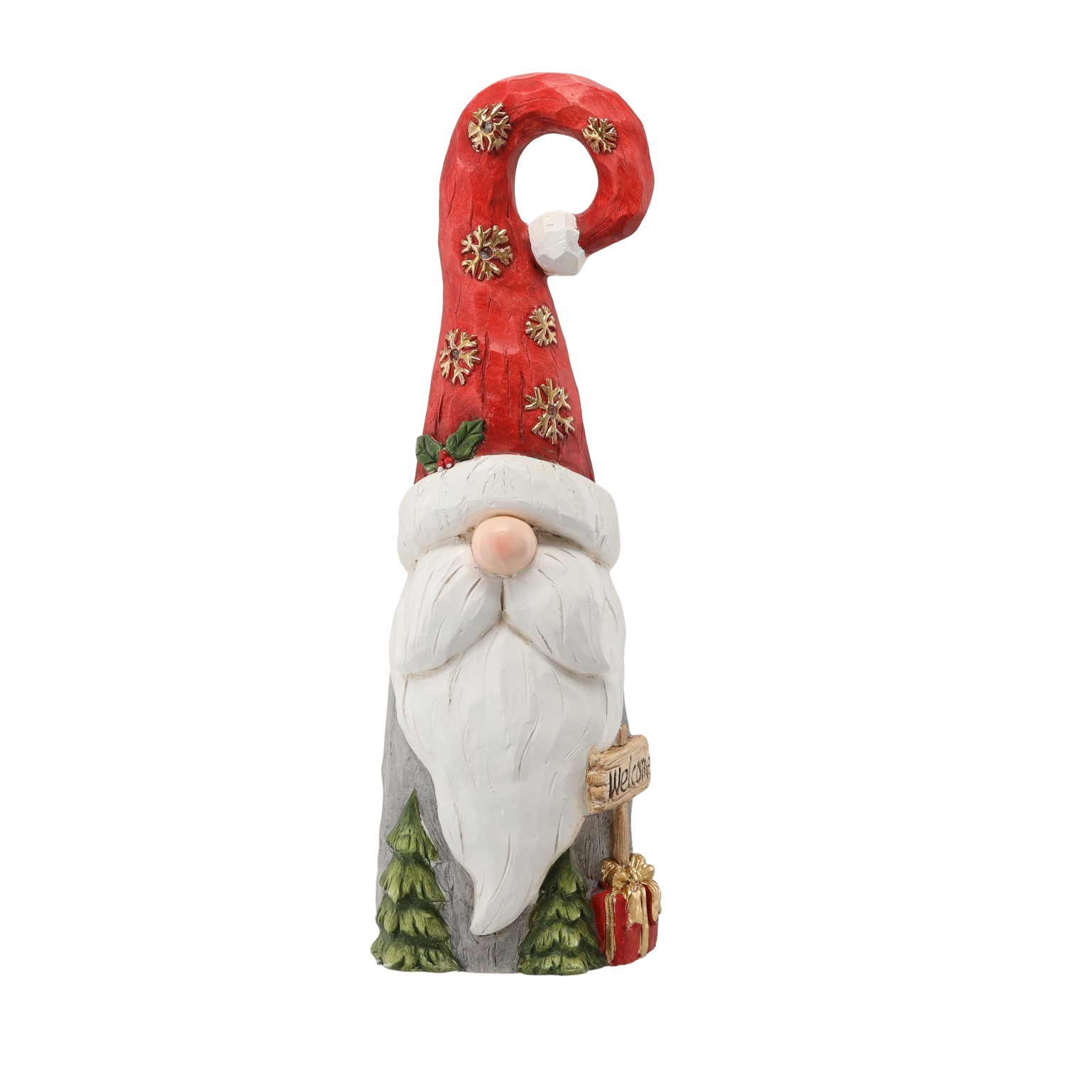 Рождественская фигурка гнома в шапке Санта-Клауса с подсветкой.Питание: 2 батарейки AAA (не входят в комплект). Материал: магнезийРазмеры: 22x21x66 см