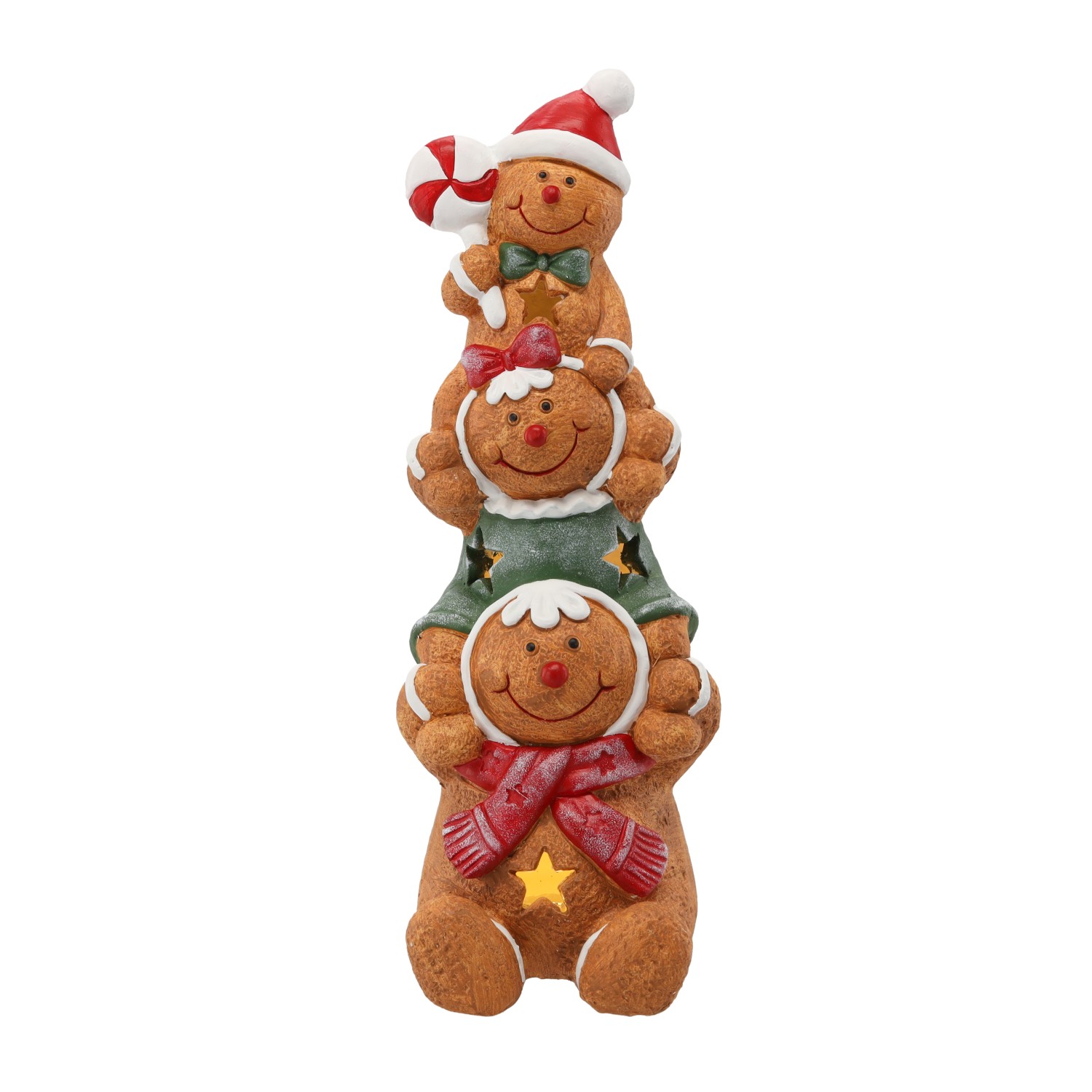 Рождественская фигурка «Три пряника» с подсветкой LEDПитание: 3 батарейки AAA (батарейки не входят в комплект)Материал: магнезияРазмеры: 16 x 16 x 43 см