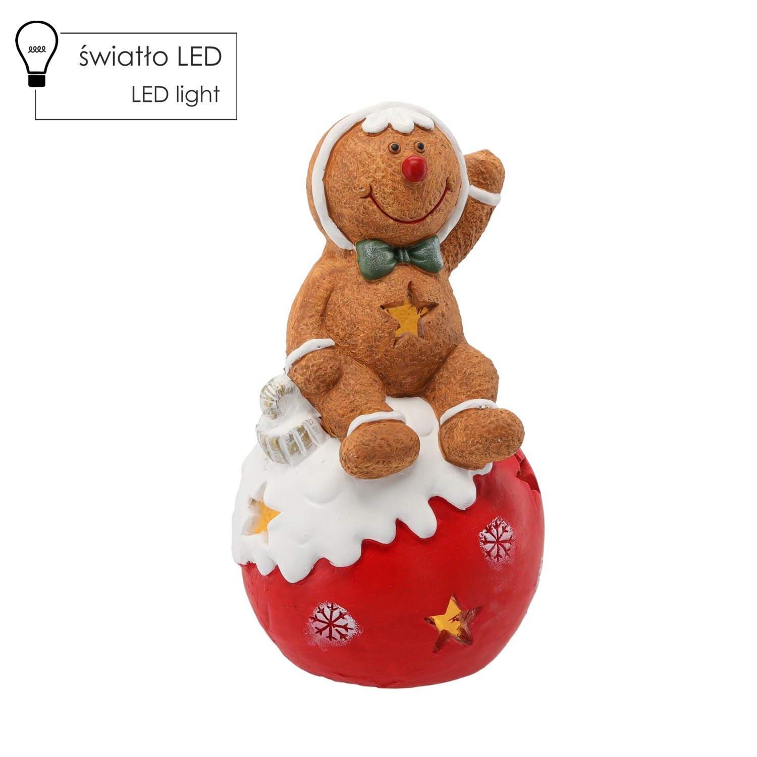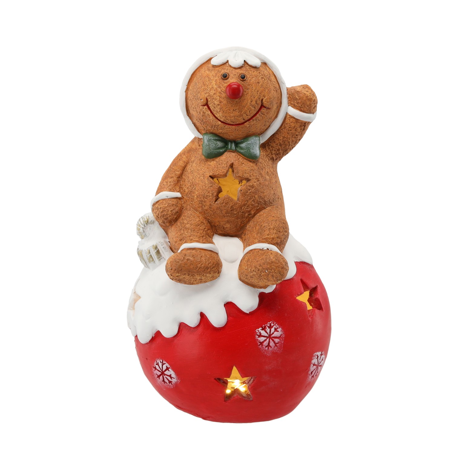 Рождественская фигурка «Пряничный человечек на елочной игрушке» с подсветкой LEDПитание: 3 батарейки AAA (батарейки не входят в комплект)Материал: магнезияРазмеры: 19 x 17 x 35 см