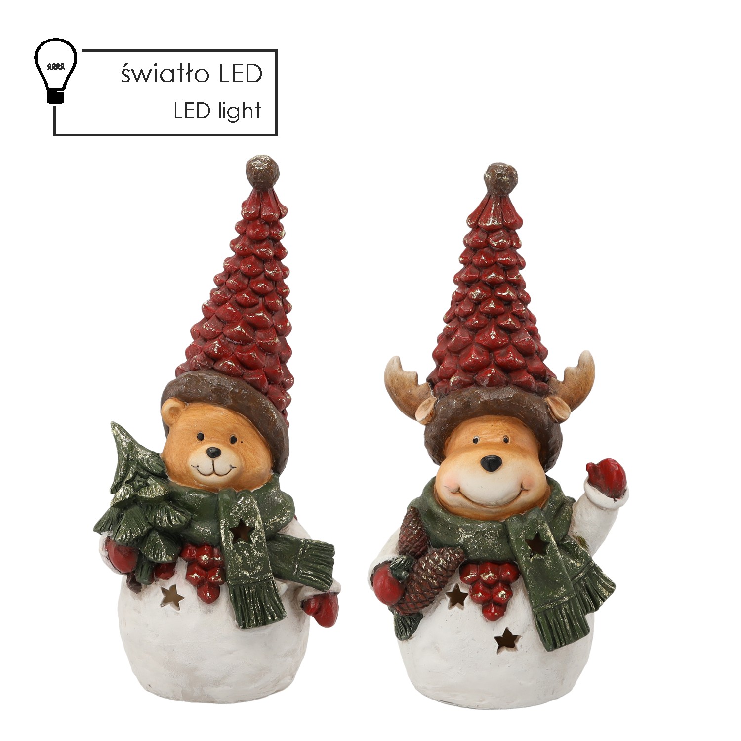 Рождественская фигурка Медведь/Олень в шапке со светодиодной подсветкойПитание: 2 батарейки LR44 (батарейки прилагаются)Материал: полимерРазмеры: Медведь 17 x 14 x 36 см / Олень 17,5 x 14,5 x 36,5 см