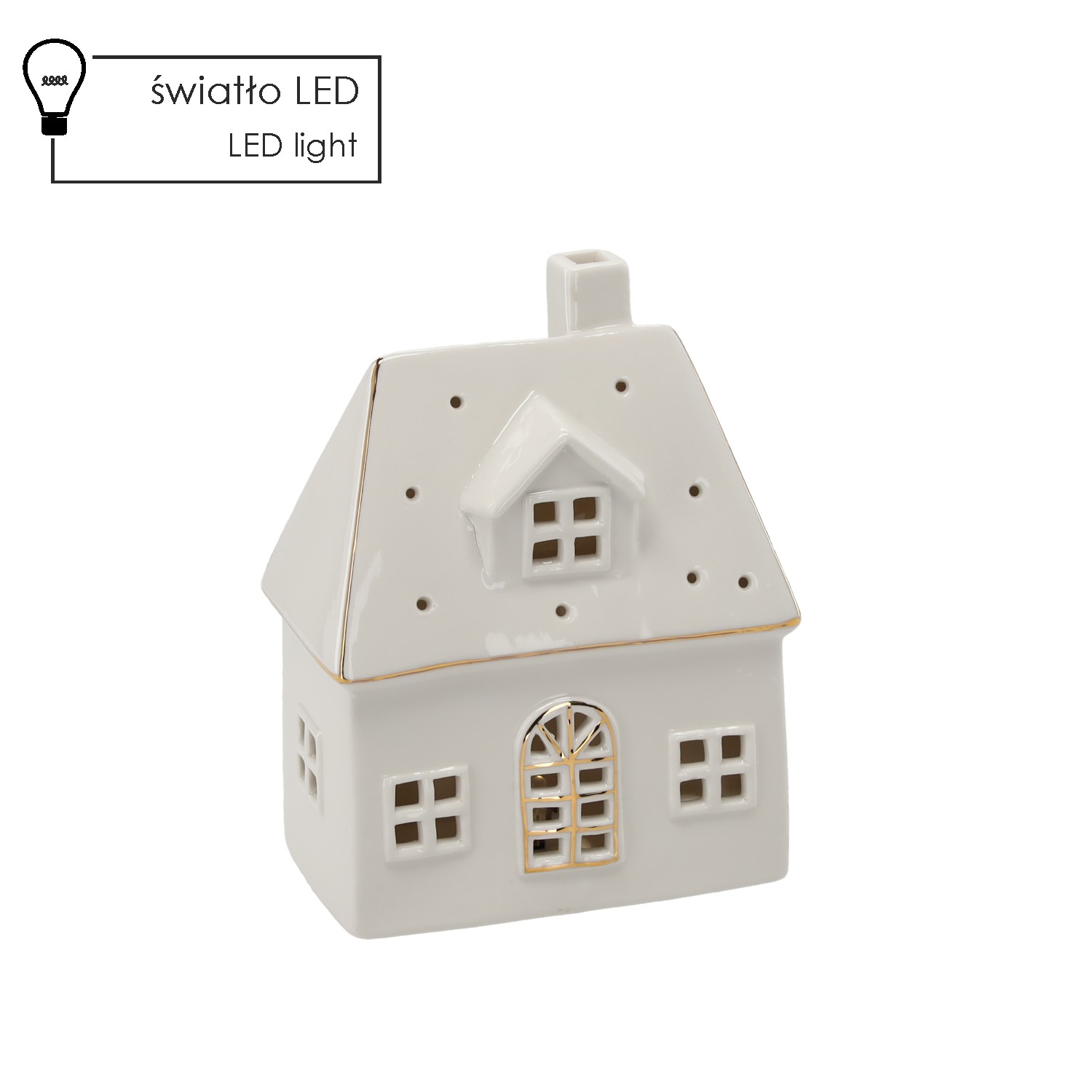 Рождественская фигурка «Керамический домик с подсветкой LED»Питание: 2 батарейки LR44 (батарейки в комплекте)Материал: керамикаРазмеры: 13,5 x 8 x 17,2 смЦвет: белый