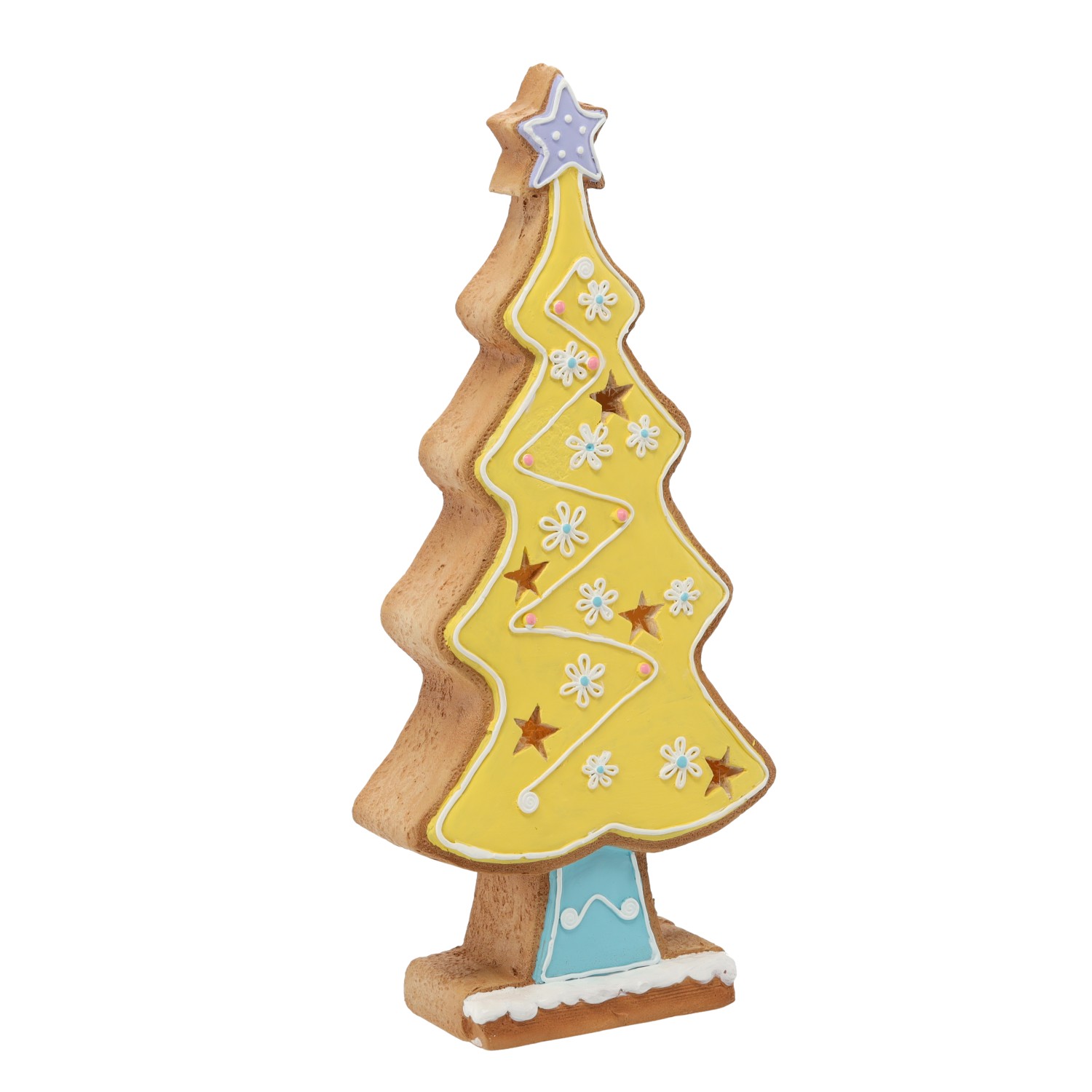 Рождественская фигурка «Гингеровое дерево» желтого цвета с LED-подсветкойПитание: 3 батарейки AAA (батарейки не входят в комплект)Материал: магнезияРазмеры: 23,8 x 9,8 x 53,6 см