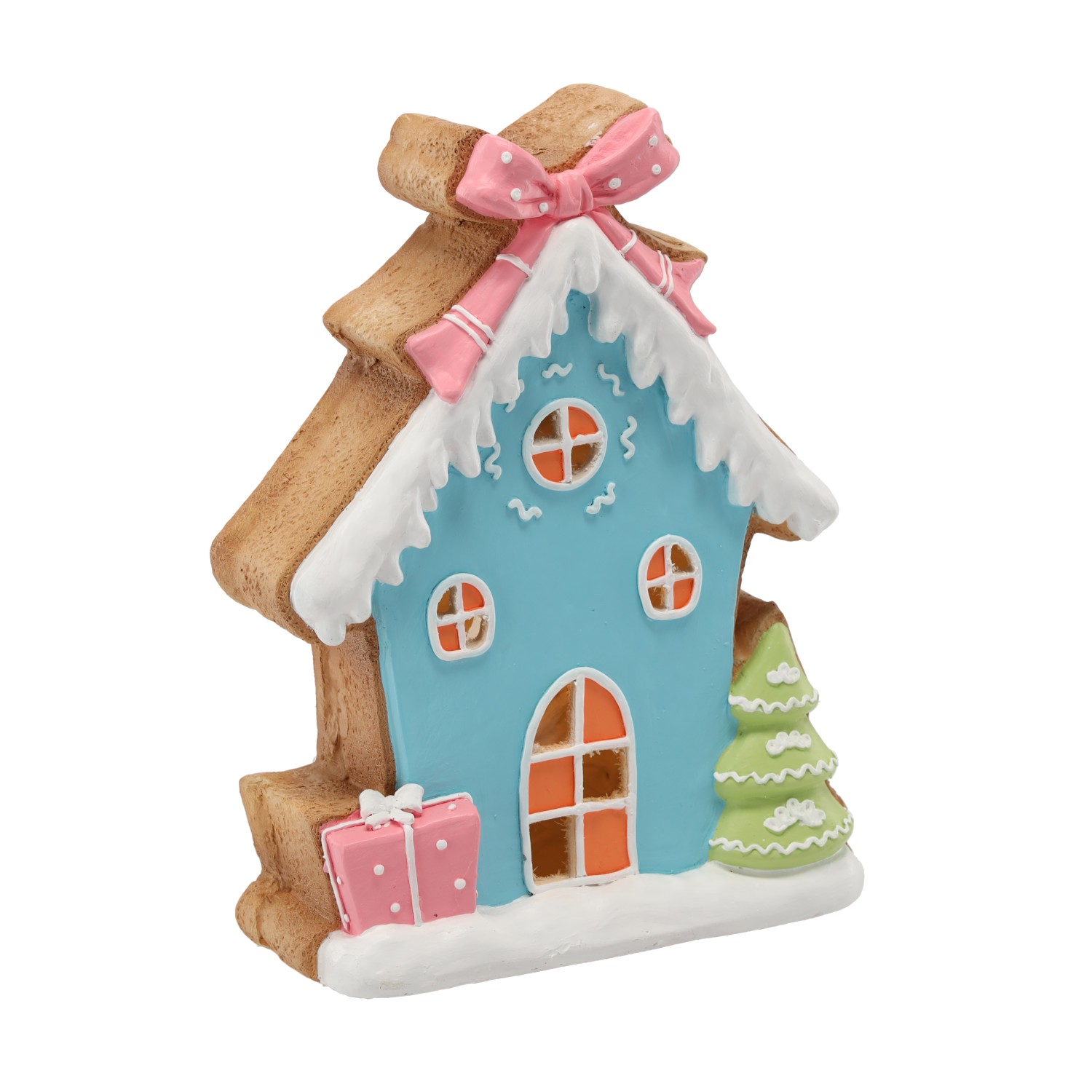 Рождественская фигурка «Гингеровый домик» с синей светодиодной подсветкойПитание: 3 батарейки AAA (батарейки не входят в комплект)Материал: магнезияРазмеры: 30,6 x 12 x 39,6 см