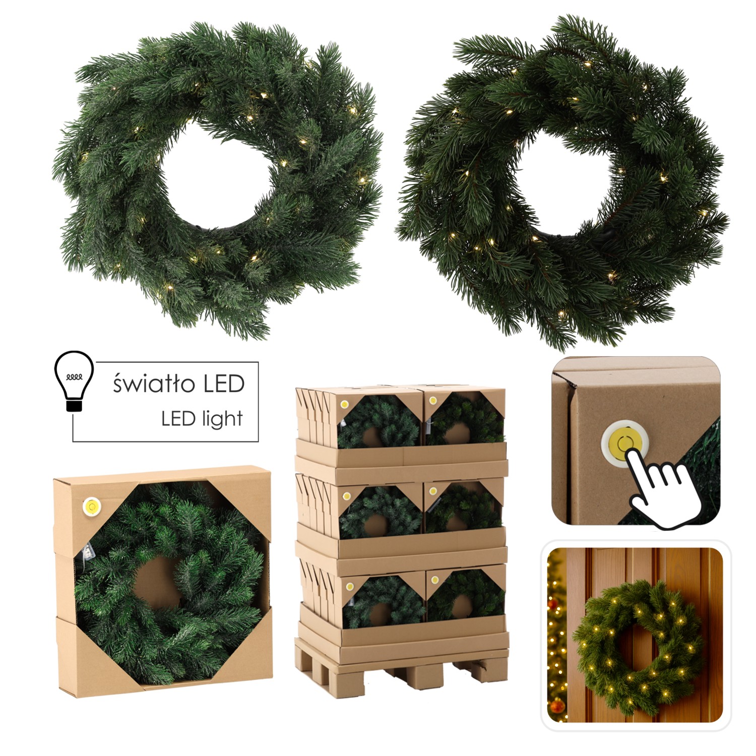 Диаметр: 35 смВарианты: натуральный («M»), с инеем («FD»)Комплектация: 30 мини-светодиодных лампочек, кнопка «Try Me»Питание: 3 батарейки AA (не входят в комплект)