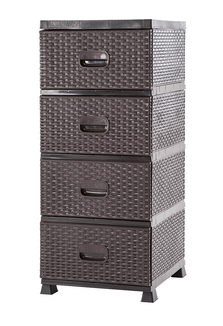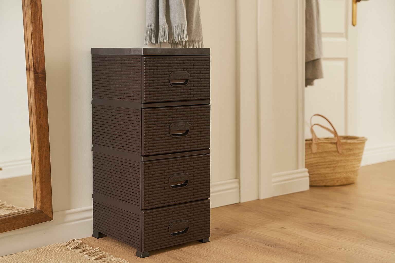 Этот современный пластиковый комод 🪑 в коричневом оттенке с эффектом ротанга 🌿 представляет собой сочетание стиля и практичности ⚡. Ее универсальный дизайн позволяет ей идеально вписаться в любой интерьер – от гостиной и спальни до офиса, гаража или террасы.