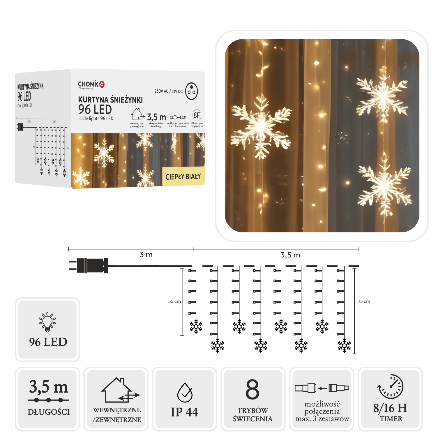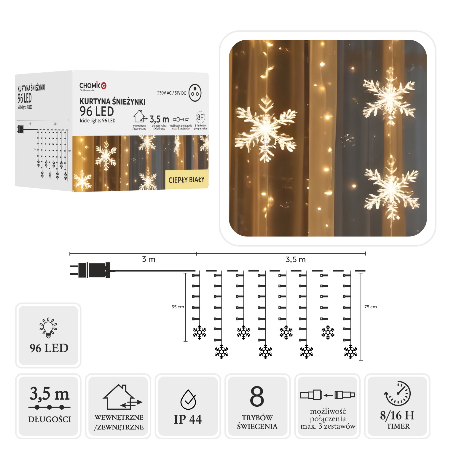 СВЕТОВАЯ ЗАВЕСА «СНЕЖИНКИ» 96L ТЕПЛО-БЕЛЫЙ, ДЛИНА 3 + 3,5 М