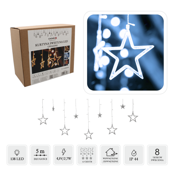 Придайте вашему интерьеру или саду праздничное сияние с помощью этой красивой световой завесы, состоящей из138 холодно-белых светодиодов, расположенных в виде больших и маленьких звездочек. Класс защиты IP44 позволяет использовать ее как внутри, так и снаружи — она прекрасно украсит окна, стены, балкон или витрину магазина.