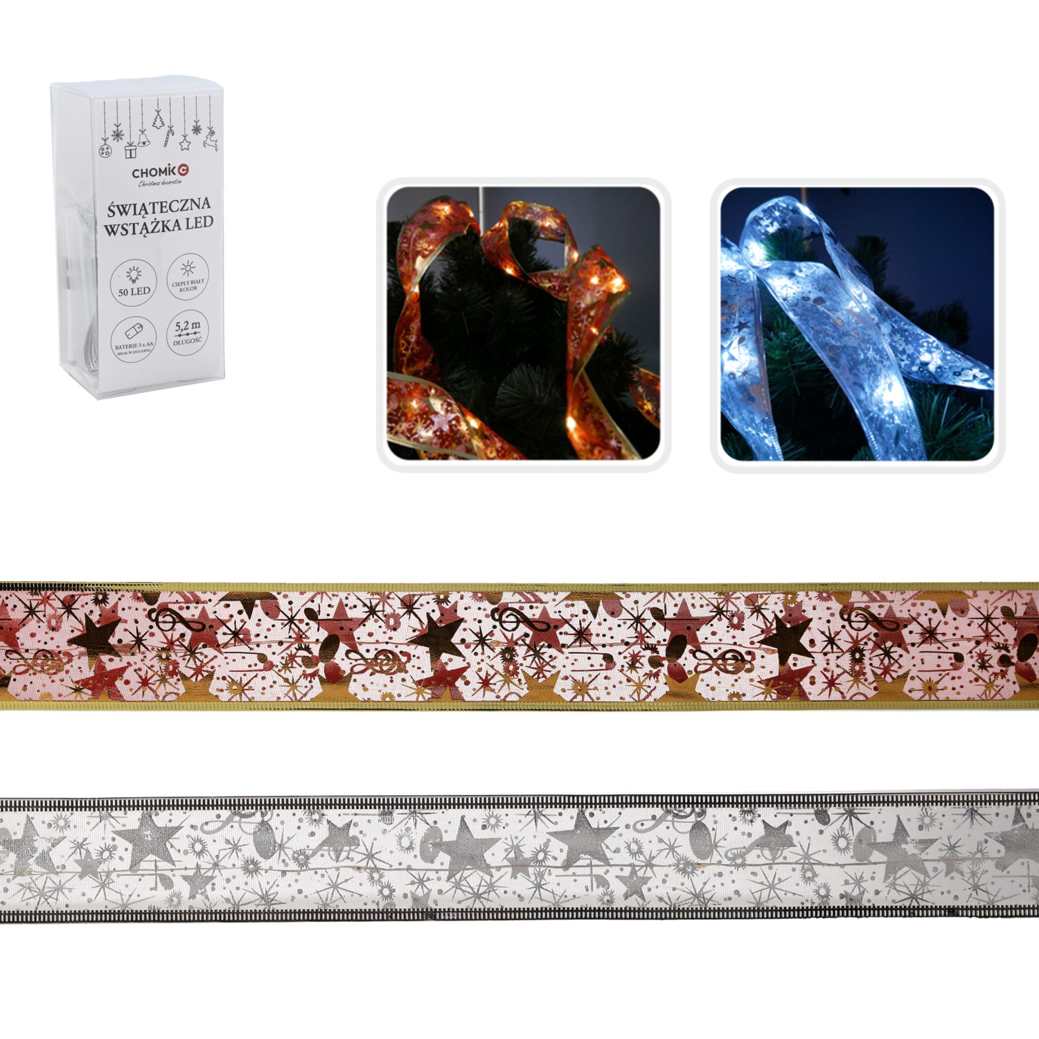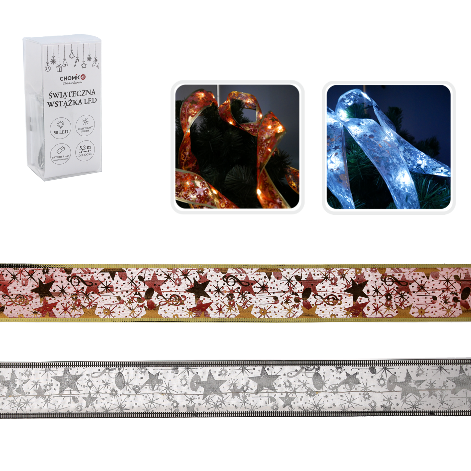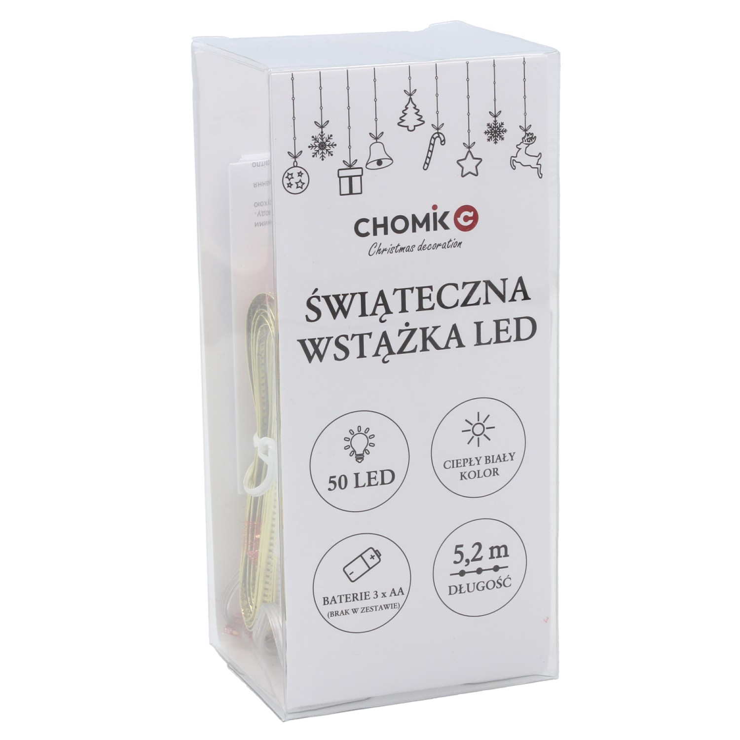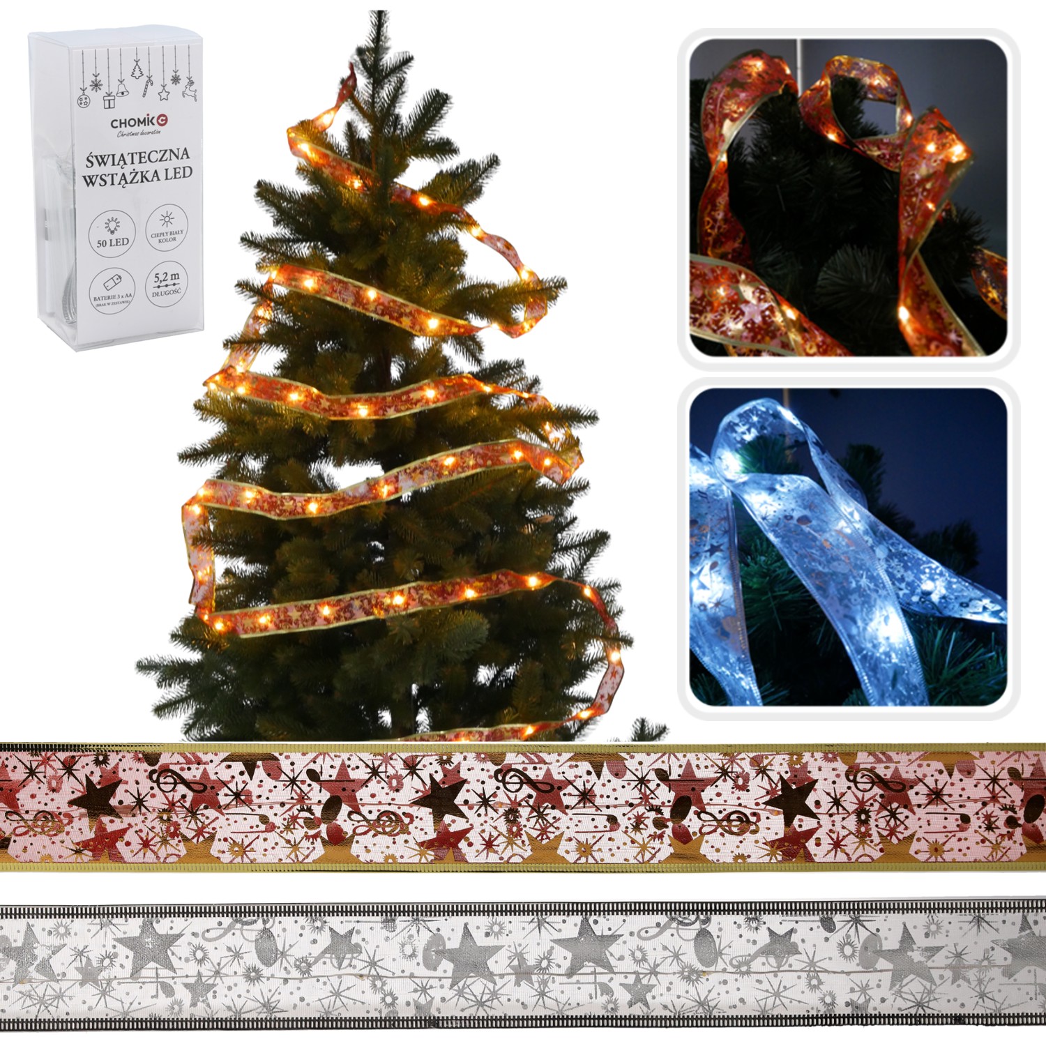 Лента доступна в красивых цветовых вариантах: красно-золотом и серебряном, украшена 50 теплыми светодиодами, которые сделают любой интерьер сияющим праздничной магией. Идеально подходит для елки, камина, перил или стола.
