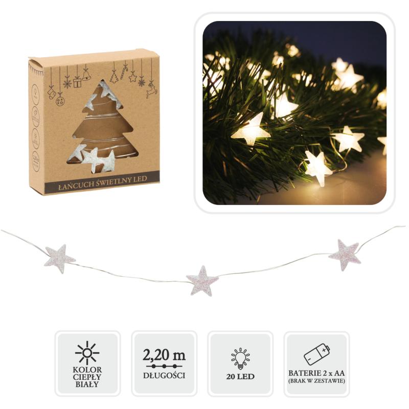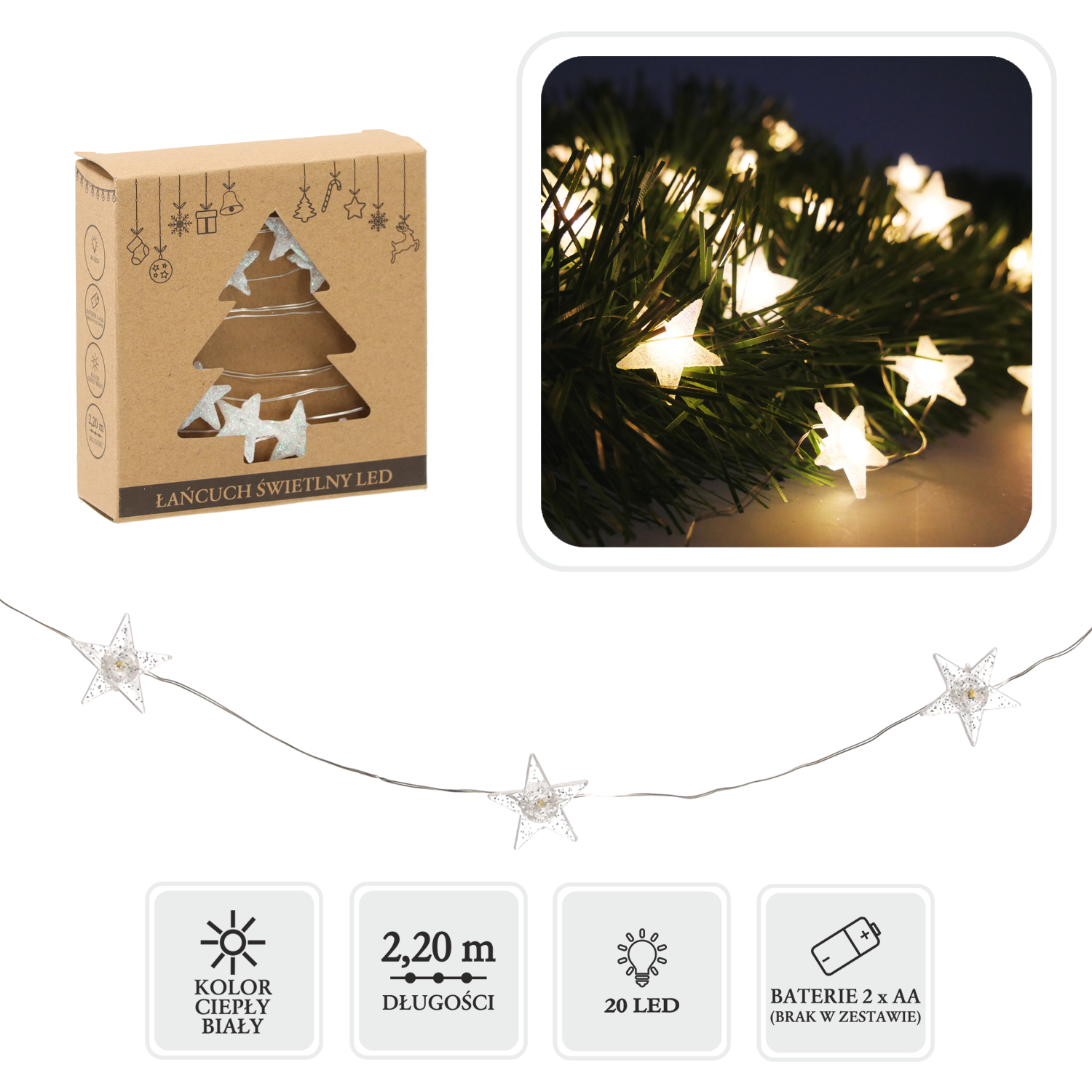 Добавьте блеска своим украшениям с помощью элегантной светодиодной гирлянды в форме звездочек с серебряным украшением. Благодаря 20 теплым светодиодам и тонкому блеску серебра, эта гирлянда идеально вписывается в зимнюю, праздничную атмосферу. Она осветит интерьеры, елки, украшения и подоконники. 🌠