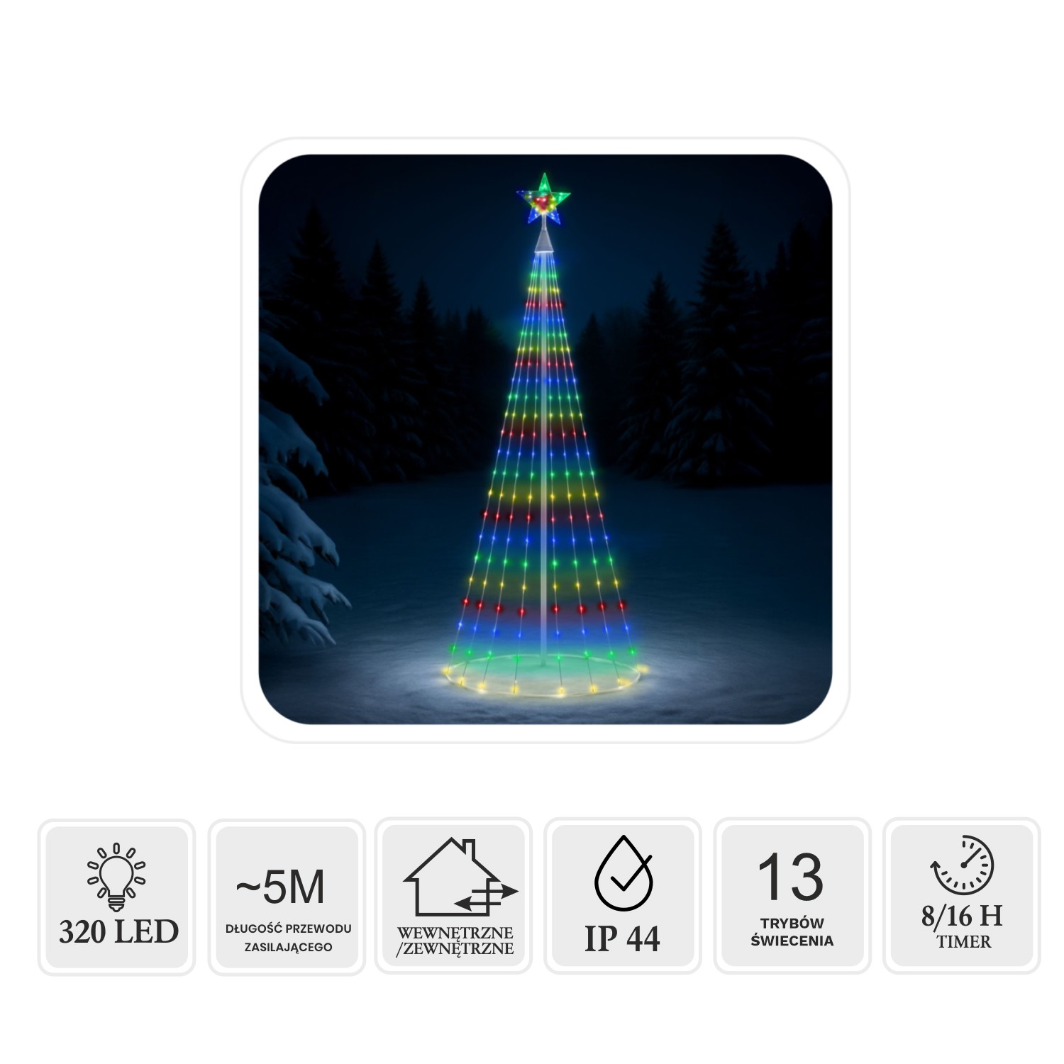 Внесите волшебство праздника в свой дом или сад с помощью этой эффектной конической LED-елки. 320 цветных диодов (многоцветных) и декоративная звезда на верхушке создают неповторимую атмосферу и привлекают внимание.