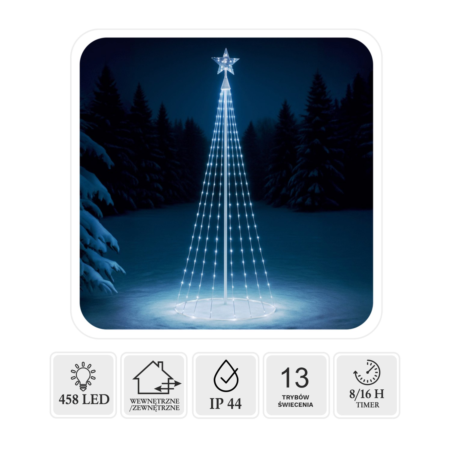 Современная коническая LED-елка высотой 3 метра представляет собой эффектное украшение, которое порадует своим ледяным блеском. Оснащенная 458 светодиодами холодного белого цвета, она прекрасно осветит сад, террасу или большое помещение, создавая элегантную и праздничную атмосферу. Прочная металлическая рама обеспечивает стабильность, а звезда на вершине подчеркивает уникальный характер украшения. 8-функциональный программатор с памятью и таймер 8/16 ч позволяют удобно управлять и настраивать световые эффекты. Прозрачный провод и класс защиты IP44 делают елку подходящей как для использования внутри, так и снаружи помещений.
