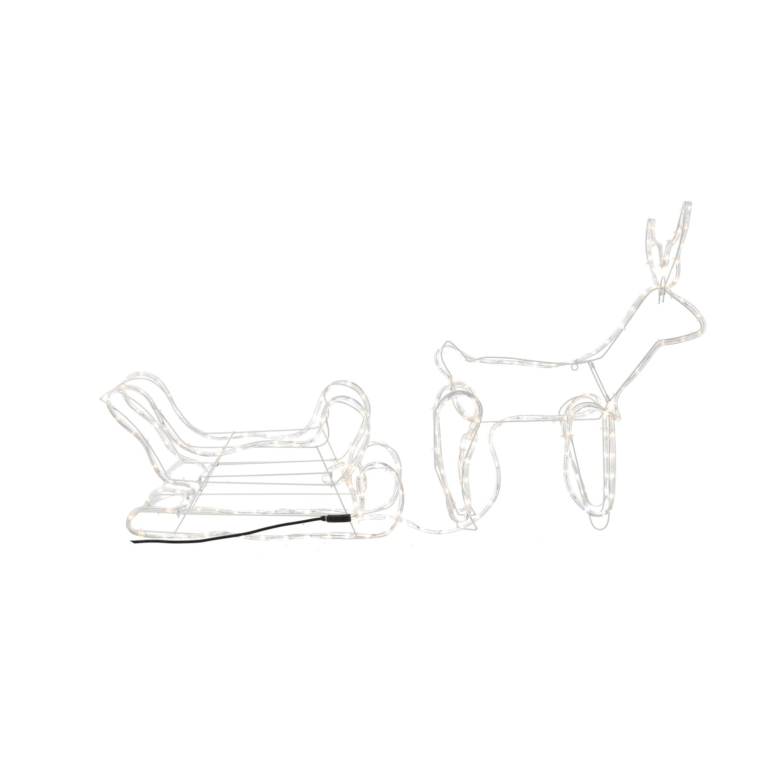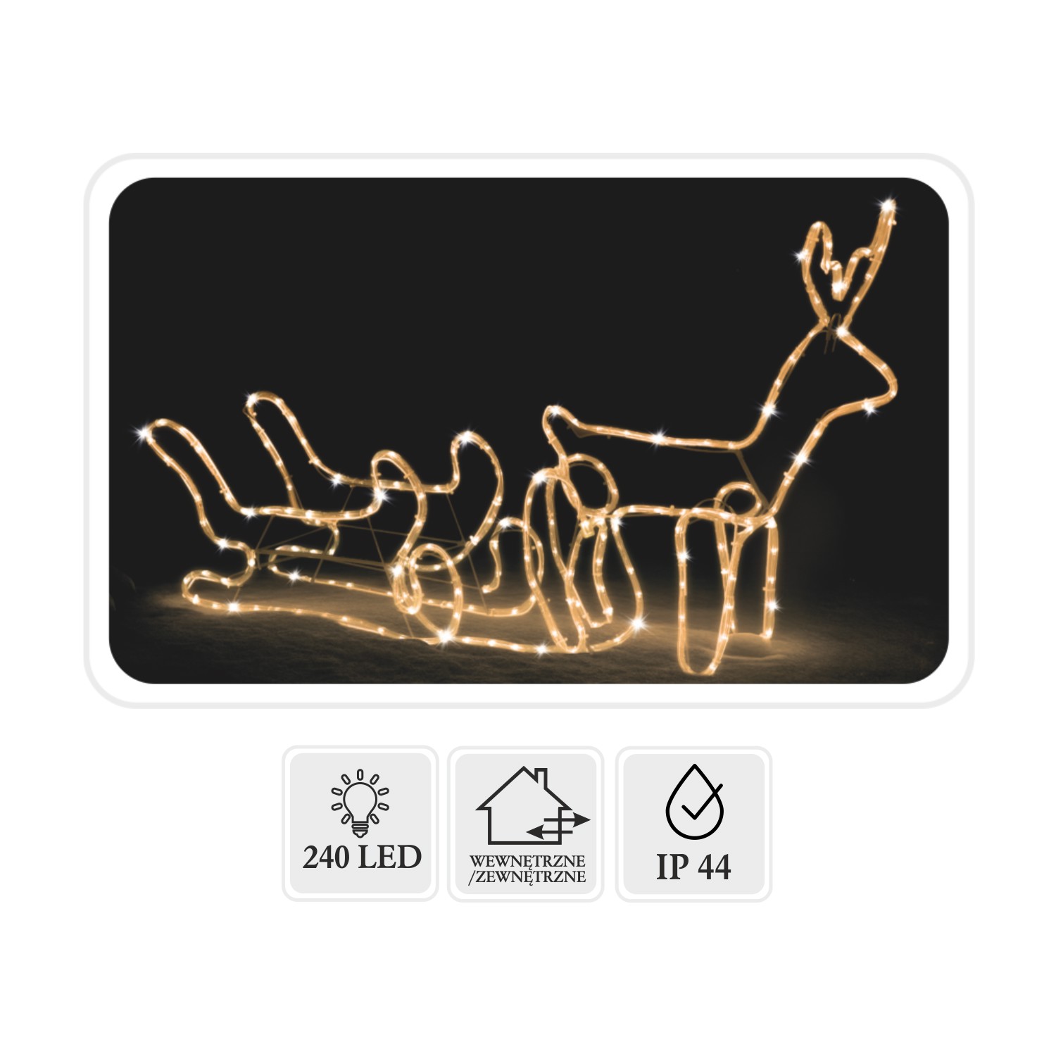 Эффектный набор светодиодных огней – олень с санями – это уникальное украшение, которое создаст волшебную атмосферу праздника. Благодаря 240 светодиодам теплого белого цвета, дополненным эффектом холодного вспышки, украшение красиво освещает пространство и привлекает внимание. Класс защиты IP44 и черный шнур питания делают украшение идеальным как для внутреннего, так и для наружного использования. Постоянный режим свечения с эффектом вспышки придает всему украшению динамичный характер, а впечатляющая общая длина 3,2 м делает его центральным элементом праздничного декора.