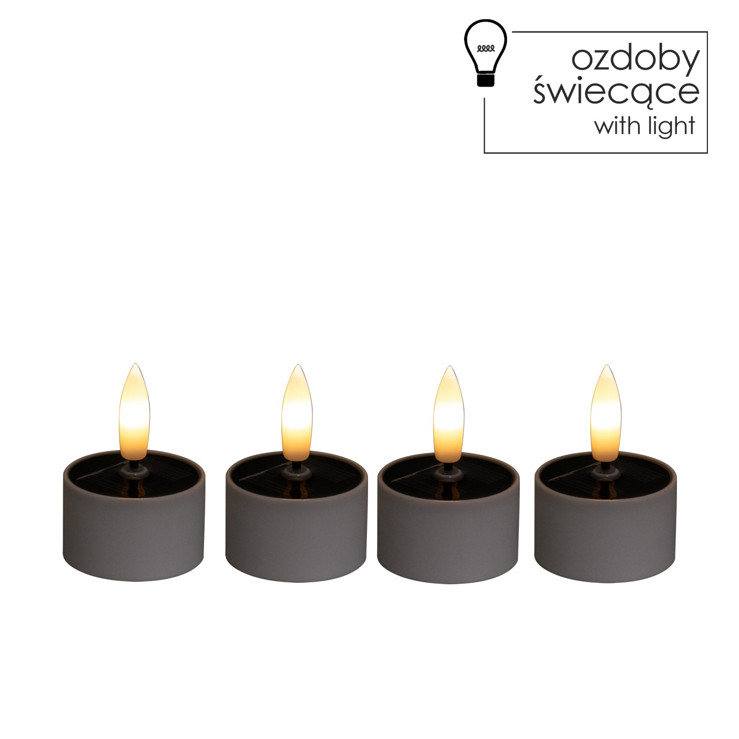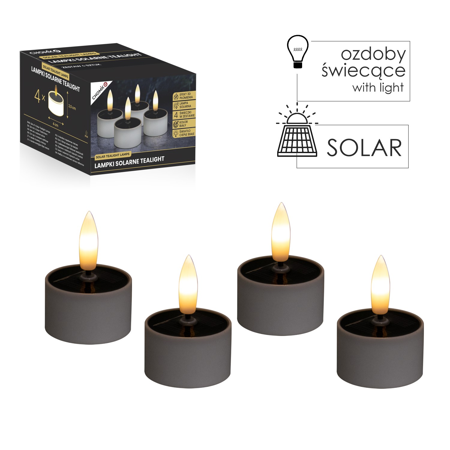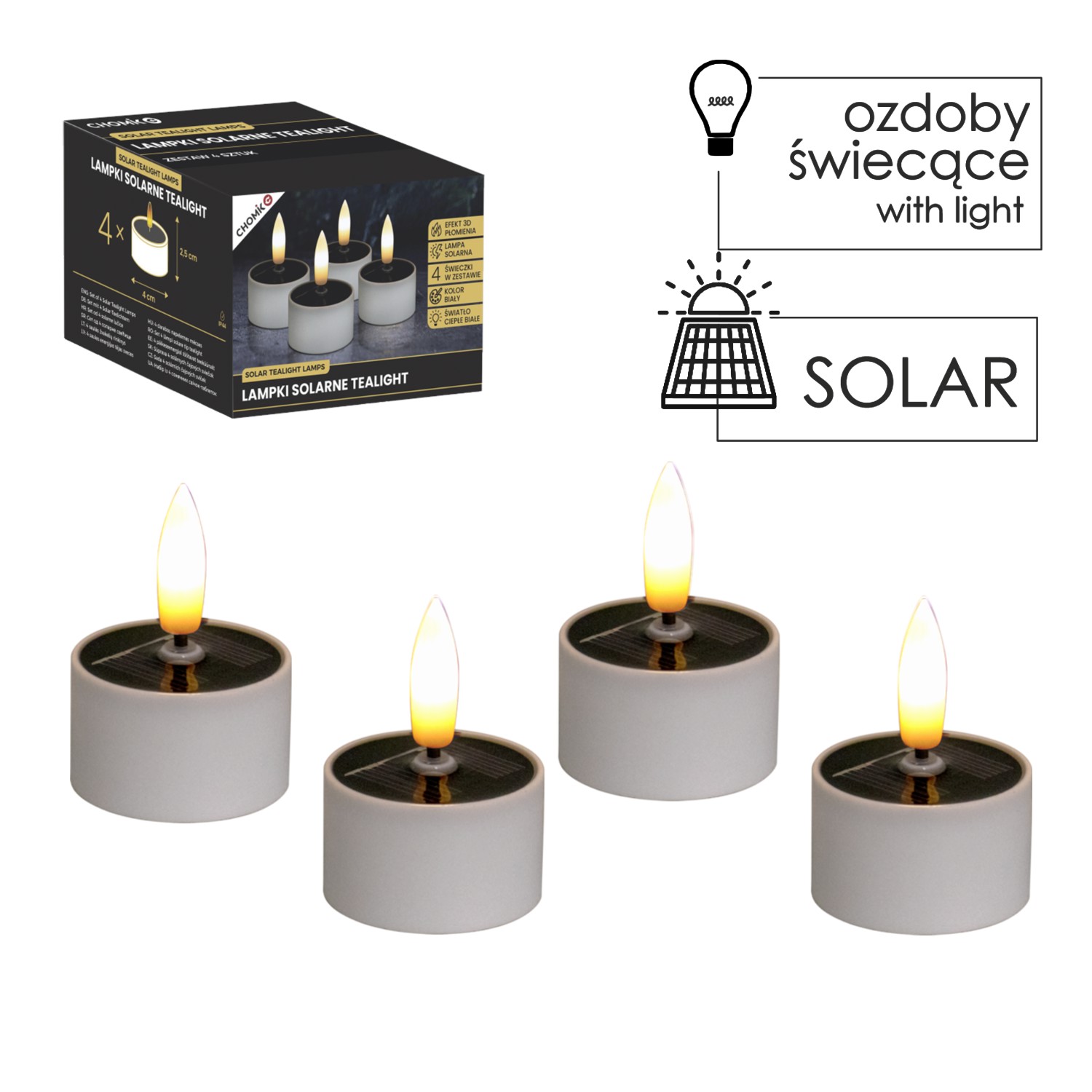 Набор из 4 пластиковых солнечных свечей, каждая из которых оснащена 3D-пламенем с эффектом мерцающего теплого белого света.Идеально подходят для украшения интерьеров и внешних пространств. Работают на солнечной энергии, обеспечивая энергосберегающее освещение.Материал: пластикРазмеры: 4x2,5 см