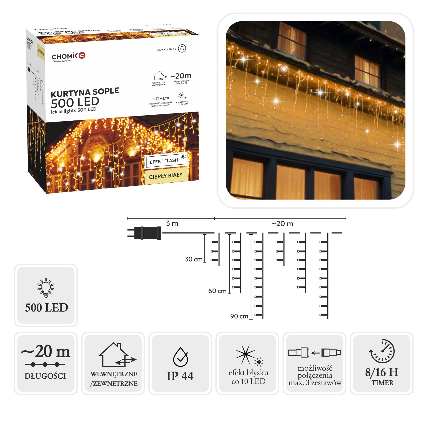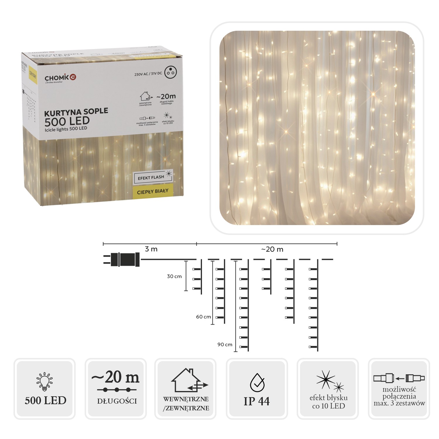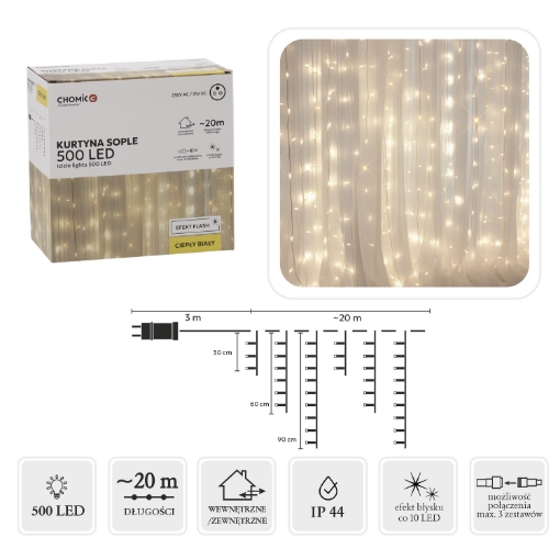 Количество светодиодов: 500L> цвет светодиодов: теплый белый + холодный вспышка > общая длина: ~ 23 м> длина световой части: ~ 20 м> длина шнура питания: 3 м> цвет изоляции: белый> Цвет трансформатора: черный> класс защиты: IP44> Программатор постоянного света с функцией памяти и таймером 8/16 ч> Режим освещения: постоянный + мигающий> длина сосулек: 30/70/40/60 см> Количество сосулек: 100> расстояние между диодами: 10 см> возможность подключения до 3 шт. световых цепей> номинальное вторичное напряжение: 31 В> номинальное первичное напряжение: 230 В> сечение питающего кабеля: 1,5 мм> Сертификат CE