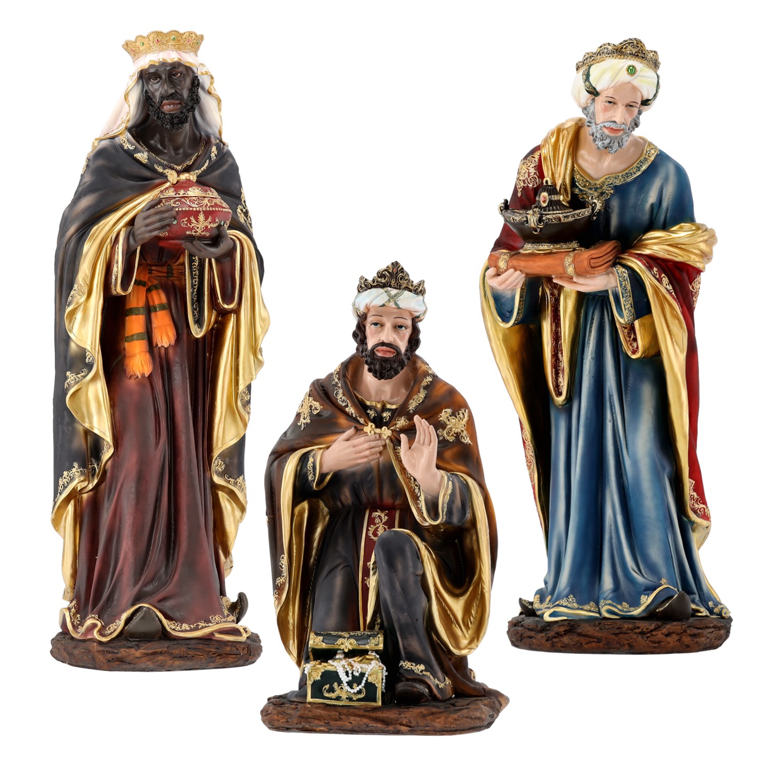 В комплект входят три фигурки королей, изображенные в разных позах и одеждах, каждая из которых держит дар – золото, ладан и смирну.📏 Размеры:✔️ Царь 1: 37 × 40 × 105 см✔️ Царь 2: 40 × 42 × 79 см✔️ Царь 3: 33 × 38 × 107 см