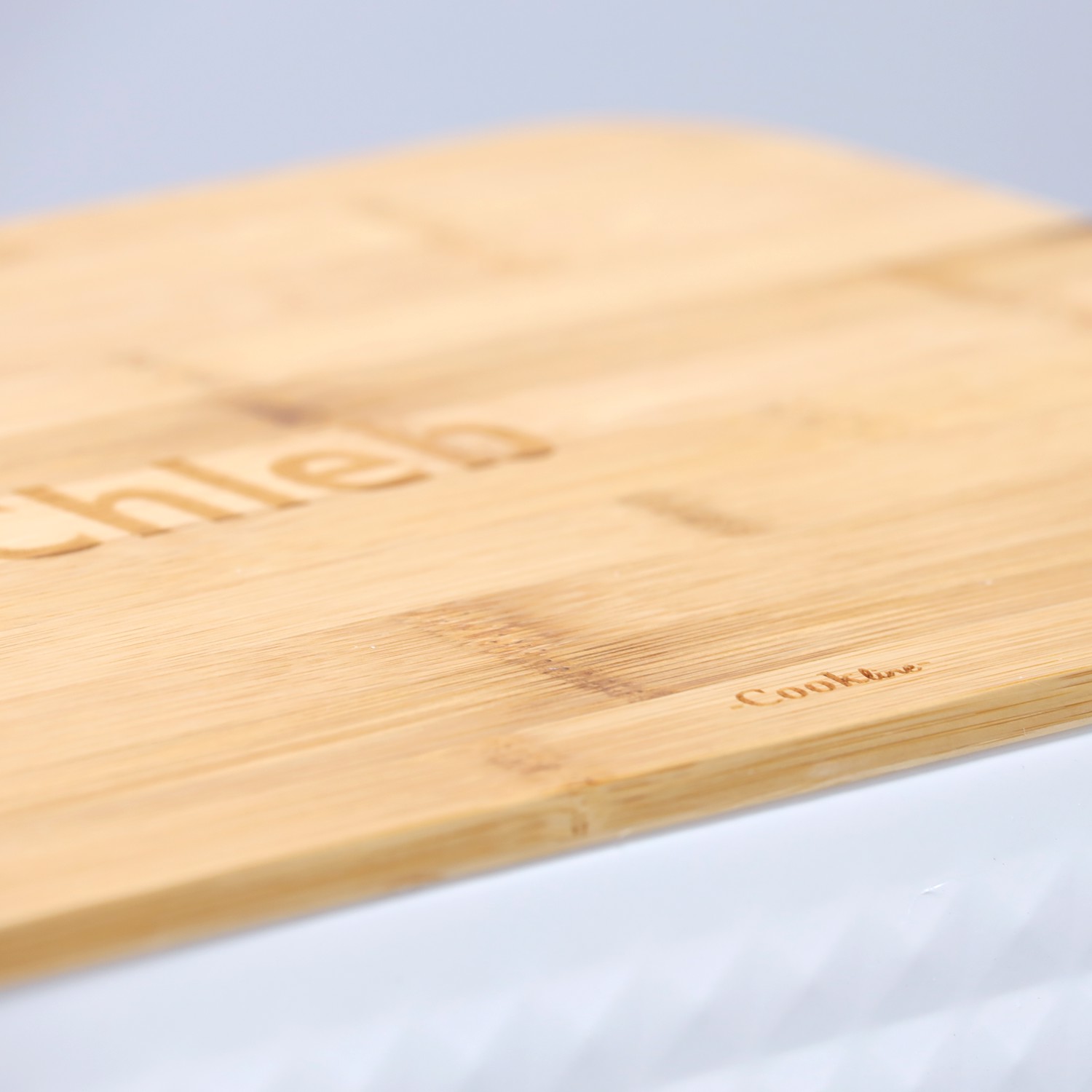 Имеет бамбуковую крышку, которая может служить разделочной доской