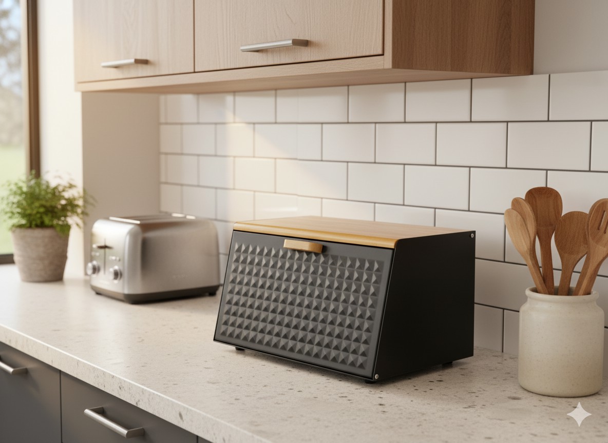 Благодаря соответствующей конструкции хлеб дольше остается свежим, столешница выглядит гораздо аккуратнее, а в целом все выглядит как из каталога современного дизайна.