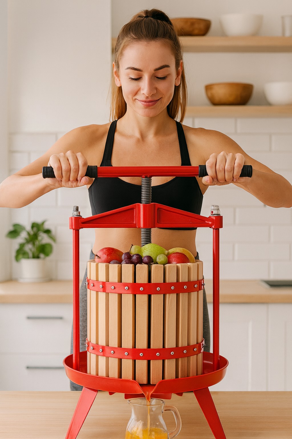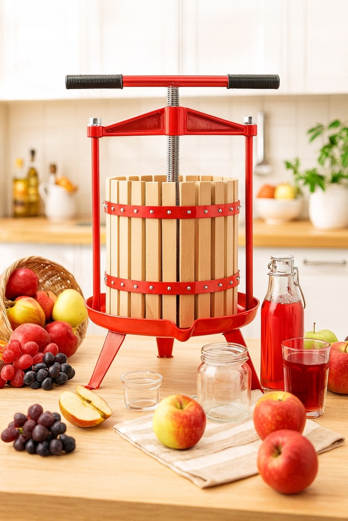 Прочная стальная конструкция и крепкие деревянные элементы обеспечивают долговечность и безопасность использования. Благодаря большой емкости можно за короткое время получить значительное количество натурального сока, например, из яблок, груш, винограда или слив (после предварительного измельчения). Ручной механизм прост в использовании и не требует питания.